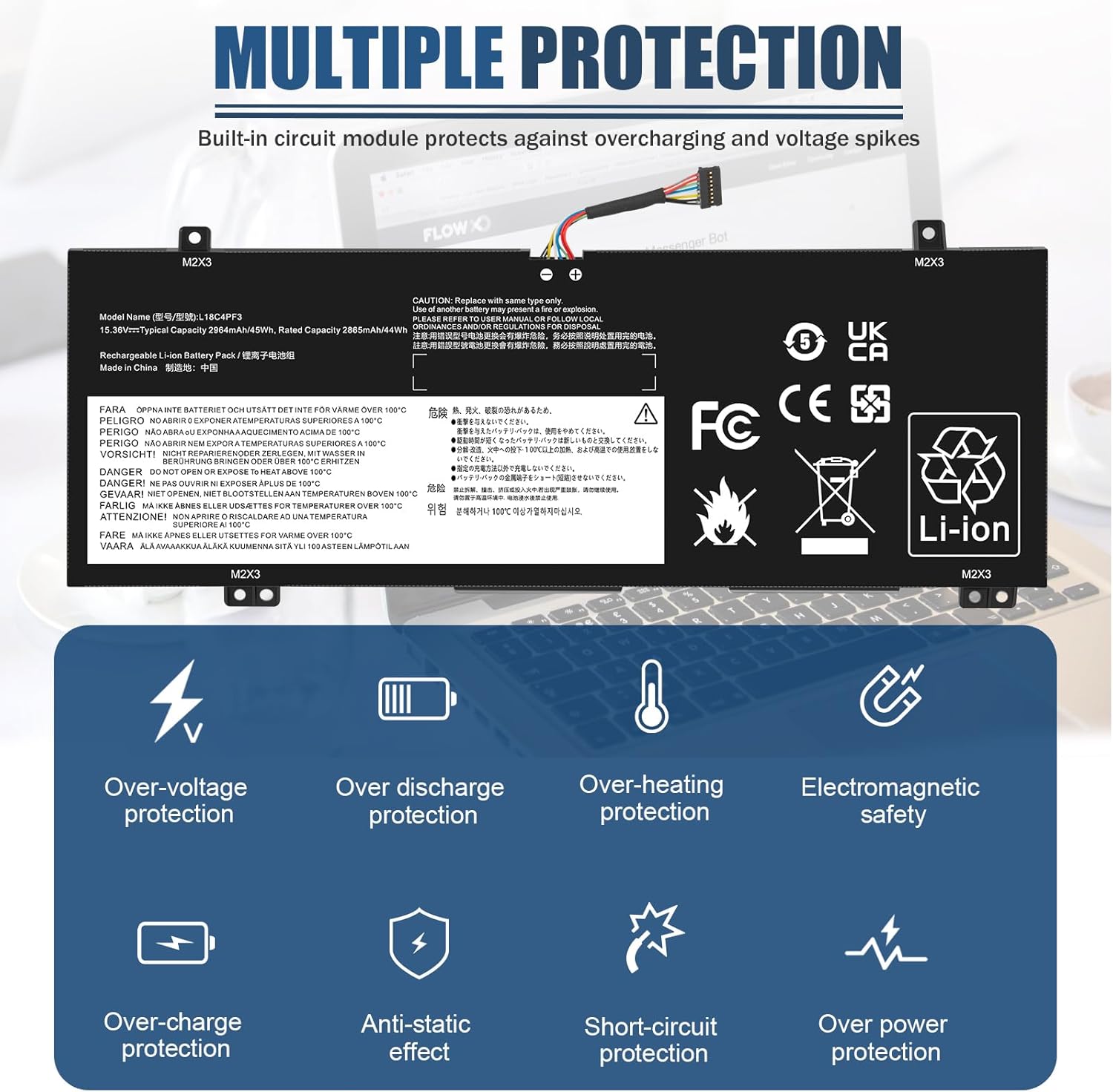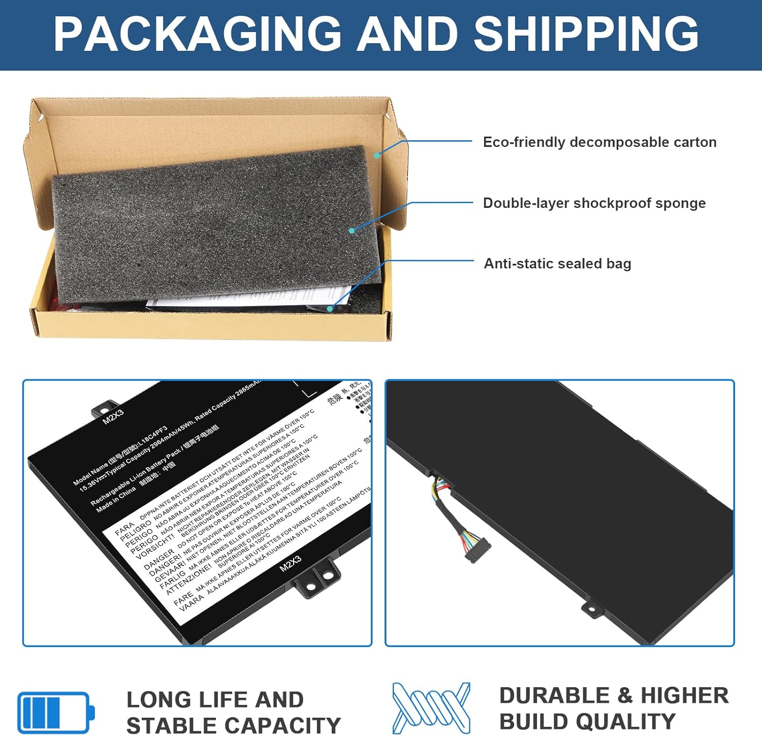 Múltiples protecciones de seguridad: nuestras baterías L18C4PF3 cuentan con múltiples protecciones, incluida la protección del circuito de sobrecarga y sobrecarga, sobretemperatura, nuestras baterías están ensambladas con materiales y placas de alta calidad para garantizar una carga rápida.