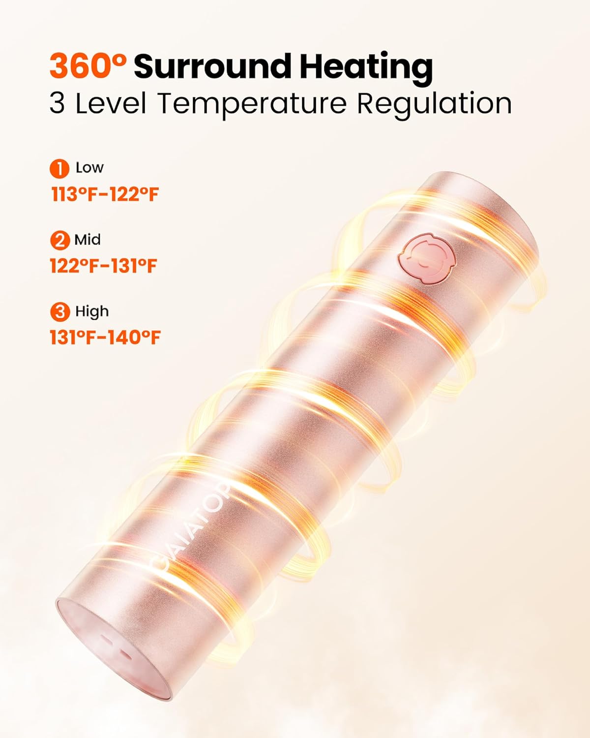 Calentamiento rápido: libera calor en 3 segundos. 3 niveles de temperatura: nivel bajo (113-122°F), nivel medio (122-131℉), nivel alto (131.0-140.0 °F/131-140℉); la temperatura de funcionamiento real puede ser afectada por la temperatura ambiente