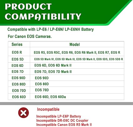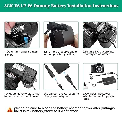 Q225 Gonine ACK-E6 Adaptador de alimentación continua LP-E6 Batería ficticia para cámaras digitales [Compatible con:] Adaptador de fuente de alimentación de CA a CC Gonine ACK-E6 batería simulada LP-E6 acoplador de CC (repuesto para batería Canon LP-E6 LP-E6N LP-E6NH) compatible con Canon EOS R, R5, R5C, R6, R6 Mark II, R7, EOS 90D, 70D, 70D. 60D, 60D Da, 6D, 6D Mark II, 7D, 7D Mark II, 5D Mark II, 5D Mark III, 5D Mark IV, 5Ds, 5Ds R Cámaras. ((( TENGA EN CUENTA: Canon EOS R5 Mark II, R5 II. ))) Solución de alimentación permanente: esta batería ficticia LP-E6 y kit de adaptador de corriente ACK-E6 te permite alimentar tu cámara Sony directamente desde una toma de pared, ideal para grabación de larga duración, transmisión en vivo, lapso de tiempo y grabación en estudio. Esencial para streamers, videógrafos y fotógrafos que exigen un rendimiento sin parar para transmisiones en vivo, videos de YouTube y eventos durante todo el día. También graban fiestas como fiestas de Halloween, fiestas de Navidad, fiestas de cumpleaños, bodas, etc. Consejo importante: asegúrate de ajustar el cable de batería virtual DR-E6 en el broche al instalar la batería virtual DR-E6. Si no se encaja correctamente, la puerta del compartimento de la batería no se puede cerrar, lo que resulta en una falla en la alimentación del dispositivo. (Para los pasos de instalación detallados, comprueba el esquema de instalación o el video en la página de detalles) [Parámetros y protección de seguridad:] Voltaje de entrada mundial: CA 100 ~ 240 V, 50 ~ 60 Hz; Salida: CC 8 V / 3 A 24 W. Está hecho de plástico de alta calidad, alambre de cobre y materiales metálicos. protección contra sobrecarga, protección contra cortocircuitos, protección de alta temperatura, protección contra sobretensiones. y utilice material ignífugo ABS. Ya disponible FCC, CE, UL, ROHS, etc. Certificación. Enviamos a toda la republica pago contra entrega. Aceptamos tarjeta de crédito y debito.