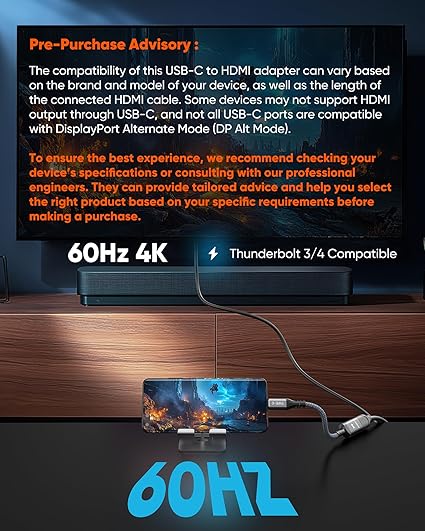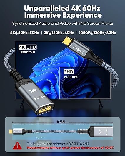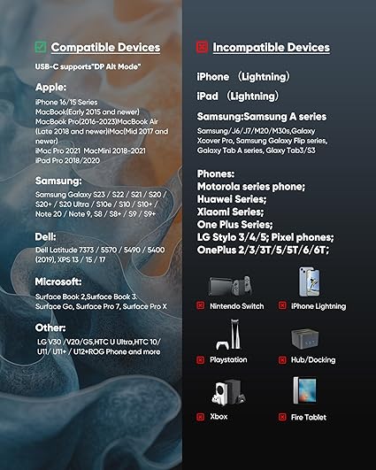 Q125 Highwings Adaptador USB C a HDMI (4K@60Hz), Adaptador de Cable USB Tipo C a HDMI, Alta velocidad Aviso de compatibilidad importante: Este adaptador USB-C a HDMI solo funciona con dispositivos que admiten el modo alternativo DisplayPort (modo alternativo DP) a través de USB-C. Si su dispositivo no admite este modo, el adaptador no funcionará. Los dispositivos compatibles comunes incluyen MacBook Pro/Air, Dell XPS, Samsung Galaxy S series, Microsoft Surface, etc. No es compatible con iPhone, la mayoría de los teléfonos Oppo/Vivo, NSwitch o puertos USB-C sin salida de video. Comprueba el puerto USB-C de tu dispositivo para ver si hay un símbolo ⚡ (Thunderbolt) o “D” (DisplayPort). Consulta la tabla de compatibilidad completa en las imágenes del producto. Solo compatible con salida de video USB-C a HDMI, no para entrada HDMI. No se puede utilizar al revés. No es compatible con la funcionalidad de carga. Adaptador USB-C a HDMI 4K mejorado: el cable adaptador Highwings 4K a 60Hz Tipo-C a HDMI adopta el último Thunderbolt 3/4 a HDMI 2.0, transmitiendo datos a velocidades de hasta 18 Gbps y una velocidad de cuadro de 60 Hz. También es compatible con HDMI 1.4, 1.3 y 1.2 anteriores Conecte y juegue la fiesta visual: el adaptador HDMI convierte instantáneamente el puerto USB-C de su computadora portátil o teléfono en un puerto HDMI, sin necesidad de instalación; la calidad de la pantalla depende del dispositivo host y de las especificaciones del cable y el monitor DISEÑO DURADERO: El diseño de resistencia flexible SR, puertos chapados en oro de 24 quilates, nailon extensible sin pestillo y grado militar puede garantizar que este adaptador USB-C a HDMI soporta hasta 25,000 tiempos de flexión y transmite señales con precisión, extendiendo en gran medida la vida útil DISEÑA TU CENTRO EN CASA/SALA DE JUEGOS: USB C a HDMI macho a hembra extiende el alcance de su cable HDMI existente, lo que facilita la conexión de dispositivos HDMI con una configuración simple plug-and-play; Conexión conveniente y flexible en cualquier ángulo Enviamos a toda la republica pago contra entrega. Aceptamos tarjeta de crédito y debito.