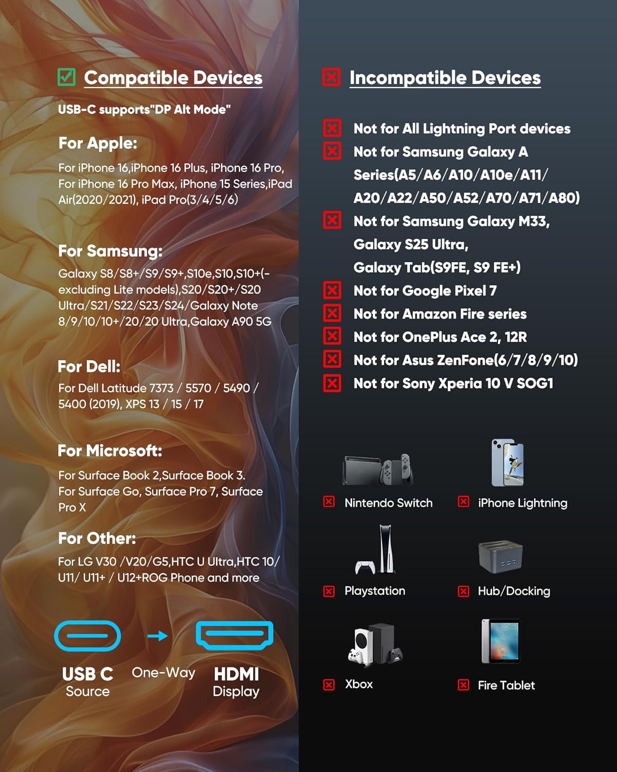 Fiesta visual inmersiva de 4K a 60 Hz: experimenta una imagen nítida y un juego suave al instante con este cable USB-C a HDMI de 4K a 60 Hz. Múltiples opciones de longitud (por ejemplo, 6 pies/10 pies/15 pies) para juegos de sofá, cine en casa o presentaciones, simplemente conecta y listo. Nota importante antes de comprar: el puerto USB C debe ser compatible con el modo alternativo DisplayPort y la función de transferencia de video