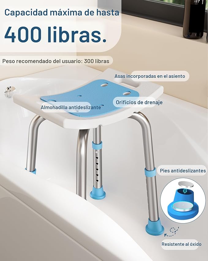 Q465 HOMLAND Silla de ducha para ducha interior, taburete de ducha ajustable Marcos de aleación de aluminio Silla de ducha duradera de 400 libras: silla de baño HOMLAND fabricada con marcos de aleación de aluminio reforzados, proporciona una resistencia máxima de hasta 400 libras. Peso recomendado del usuario: 300 libras. Dimensiones del banco de baño: Ancho: 17 pulgadas x Longitud: 10.5 pulgadas Patas de goma antideslizantes: Las patas anchas y resistentes al deslizamiento proporcionan una fijación segura al piso de la bañera o la ducha. Almohadillas de acero inoxidable: pies reforzados, estables y nunca te preocupes por las manchas de óxido Altura ajustable: altura ajustable del asiento con incrementos de 1 pulgada para garantizar que sea adaptable y se ajuste a cualquier baño. Enviamos a toda la republica pago contra entrega. Aceptamos tarjeta de crédito y debito.