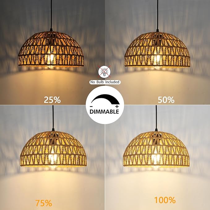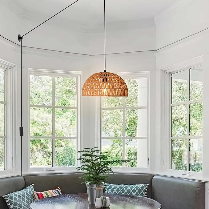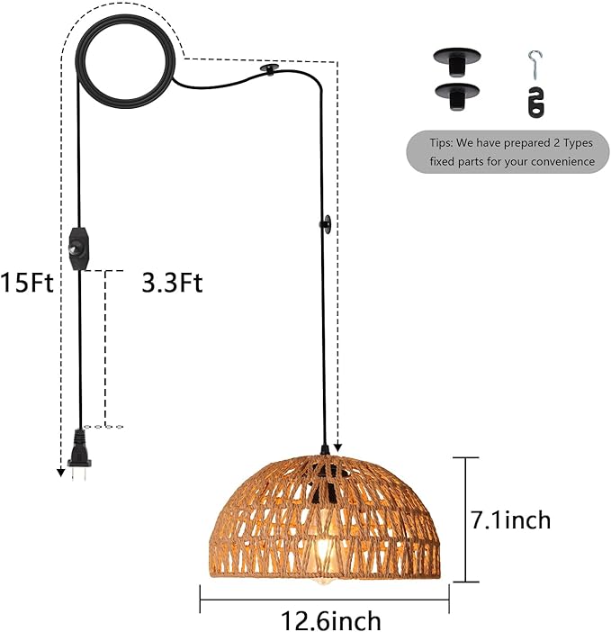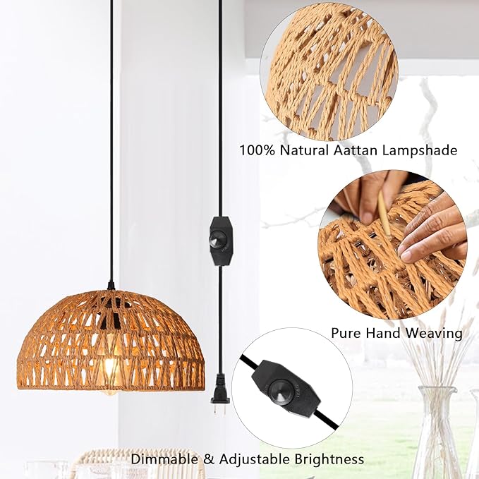 Q445 HuisMier Lámpara colgante de ratán enchufable con cable (No trae accesorios de instalación) Diseño simple y de ratán: la lámpara colgante enchufable adopta un diseño de pantalla de ratán natural, que combina estilo bohemio y estilo moderno. Viene con hermosos detalles delicados y emite una luz suave y bien proporcionada, y la luz que proyecta en la pared es muy hermosa. Esta lámpara colgante de ratán es la mejor opción para decorar tu hogar o dársela a tus familiares y amigos 【Con interruptor de atenuación】Las luces colgantes bohemias están diseñadas con un interruptor regulable de 0% a 100% de brillo, gira el interruptor para ajustar el brillo como prefieras. El cable enchufable mide 15 pies de largo, lo que puede satisfacer tus diversas necesidades de iluminación. (Nota: Bombilla no incluida, necesitas preparar una bombilla regulable) Fácil de instalar: la lámpara colgante con enchufe viene con todos los accesorios e instrucciones de instalación con imágenes para una instalación fácil y rápida, puedes ajustar la altura de suspensión según necesites. Consejos: Hemos preparado dos tipos de piezas fijas, puede elegir el método apropiado de acuerdo a sus necesidades, o usarlos juntos. Amplia aplicación: esta lámpara colgante enchufable está hecha de mimbre natural, que es reciclable y respetuoso con el medio ambiente. Crea un ambiente suave y cálido para tu habitación, perfecto para isla de cocina, comedor, sala de estar, dormitorio, estudio, pasillo, vestíbulo, entrada, cafetería, bar, granja, decoración de boda o fiesta temática bohemia, etc. Enviamos a toda la republica pago contra entrega. Aceptamos tarjeta de crédito y debito