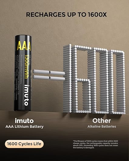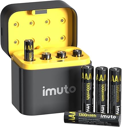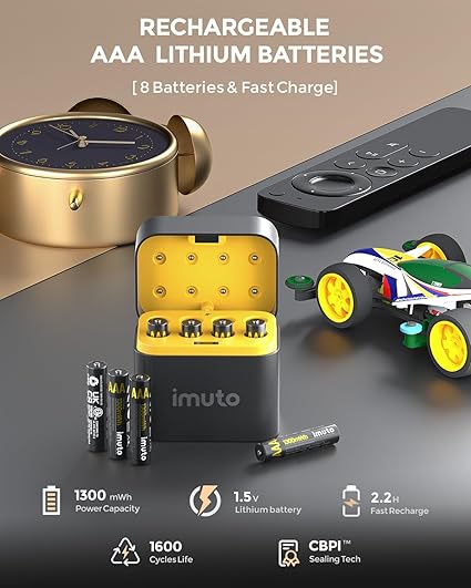 Q295 imuto Baterías AAA recargables de litio, paquete de 8 con cargador rápido, 1300 mWh 1.5 V de salida Capacidad ultra alta y salida de voltaje de 1.5V】 Baterías recargables de litio AAA imuto con una alta capacidad de 1300mWh y mayor densidad energética, lo que permite un alto número de ciclos de carga/descarga y una larga vida útil. Salida constante de 1.5V durante todo el proceso hasta que la energía se agote por completo, manteniendo tu dispositivo en óptimas condiciones en todo momento. 【1600 ciclos, ahorro de dinero】1 paquete de batería de litio AAA de imuto que se puede recargar hasta 1600 veces. Es equivalente a miles de baterías secas. Considerando su vida útil de batería de 12 años, baja autodescarga y uso a largo plazo ahorra mucho dinero en comparación con las baterías desechables. 【Carga integrada y almacenamiento】El cargador de pilas de 8 ranuras puede cargar de 1 a 8 pilas AA al mismo tiempo. Este cargador también se puede usar como una caja para almacenar pilas AA cuando no se está cargando. No tienes que preocuparte por las baterías esparcidas en el cajón y no poder encontrarlas cuando necesites usarlas. Todo lo que necesitas está en una unidad compacta, perfecta para uso doméstico y de viaje 【Tecnología de carga rápida de 2.2 horas】2.2 horas de carga rápida para 1-8 piezas de baterías de litio AA, reduce tu tiempo de espera. El puerto de carga tipo C es adecuado para todo tipo de entrada de interfaz, puedes usar una laptop, cargador de coche, banco de energía, adaptadores, etc. para cargar la batería, haz que la carga sea más flexible. (Recomendado: 5V/3A) 【Ideal para dispositivos de alto consumo de energía】Las baterías de litio AAA recargables imuto con cargador son ideales para dispositivos de alto consumo de energía, como afeitadora, ratón, calculadoras, teclado, control remoto, báscula electrónica, radio, juguetes para niños, reloj de alarma, monitor de presión arterial, etc. Enviamos a toda la republica pago contra entrega. Aceptamos tarjeta de crédito y debito.