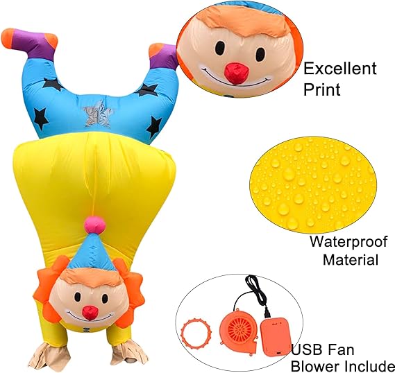 ZISUEX El paquete incluye: disfraz inflable de payaso para adultos, adecuado para la mayoría de los adultos. El paquete de disfraz de payaso incluye 1 disfraz inflable de payaso, 1 mini ventilador USB, mini ventilador de disfraz de payaso que requiere 4 pilas AA y alimentación móvil conectada por USB (no incluye batería)