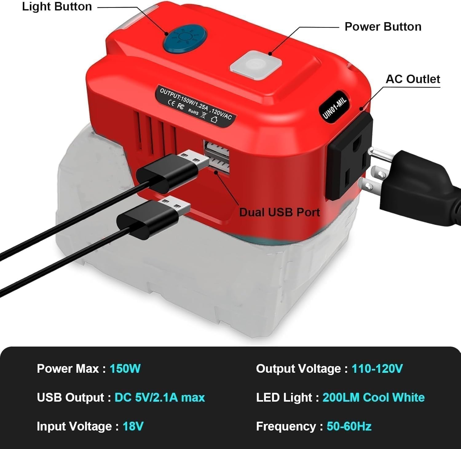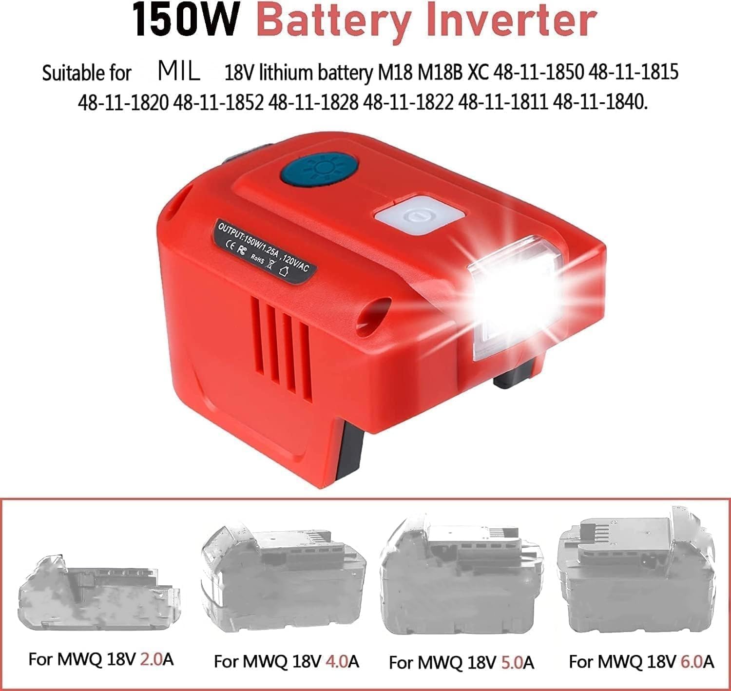 Inversor de corriente para batería Milwaukee de 18 V, convertidor de potencia de 150 W con 2 puertos USB y 1 salida de CA