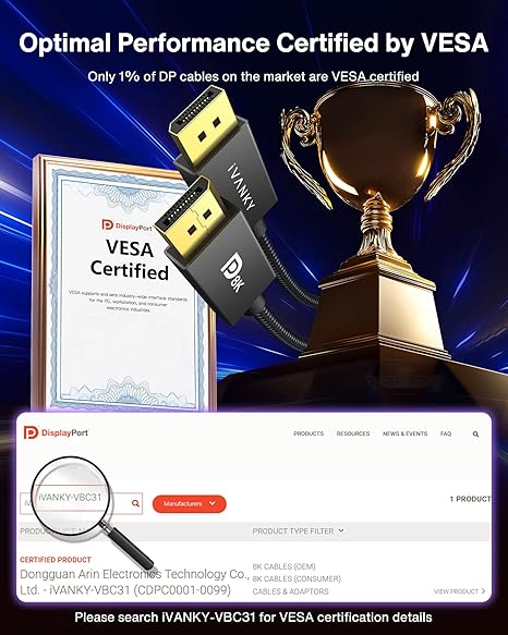 Q195 IVANKY Cable DisplayPort 8K 1.4, cable DP certificado VESA de 6.6 pies.