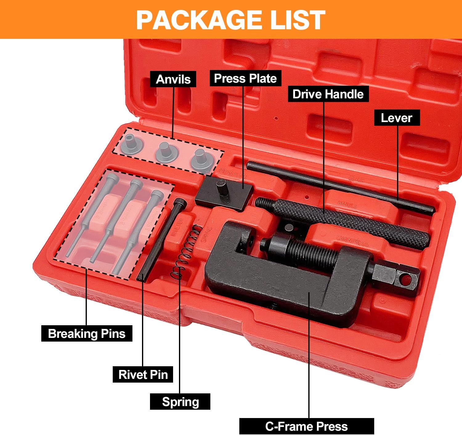 El kit de herramientas para romper cadenas es el asistente ideal para ayudarte a reemplazar cualquier cadena de motocicleta desgastada, sacar eslabones de cadenas largas de bicicleta o extender cadenas que son demasiado cortas.