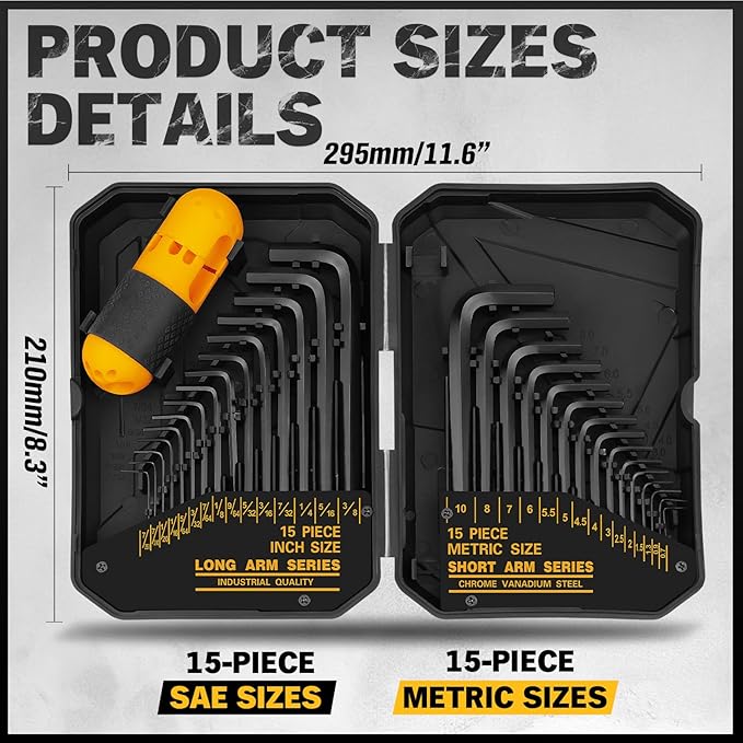 Q225.00 Juego de llaves hexagonales de 31 piezas – Juego de llaves Allen SAE Material de alta calidad: acero tratado térmicamente con acabado de óxido negro, con 15 teclas de largo alcance y 15 teclas cortas de alto apalancamiento para mayor durabilidad y resistencia. 【Alto apalancamiento】El extremo de accionamiento convencional en teclas largas y cortas permite un alto apalancamiento en fijaciones difíciles, asegurando un funcionamiento eficiente. Mango de torsión: viene con un mango de torsión para mayor fuerza durante la carga y descarga de sujetadores, aumentando el alcance y mejorando el rendimiento del par. Cobertura completa: juego de llaves Allen de 31 piezas con medidas métricas y en pulgadas, que cubren todos los tornillos hexagonales para un uso completo. Fácil organización: marcas de tamaño de alta visibilidad en cada llave y una funda de transporte resistente para una rápida selección de tamaño y almacenamiento cómodo. Enviamos a toda la republica pago contra entrega. Aceptamos tarjeta de crédito y debito.