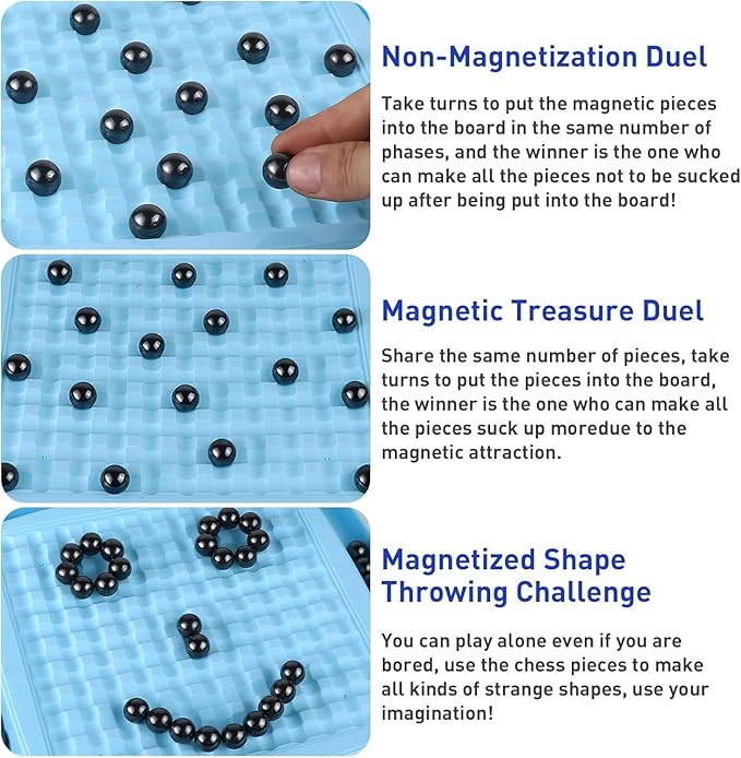 Q145.00 Juego de mesa de ajedrez magnético, juego de magnetismo contra ajedrez, 20 bolas magnéticas. Juego de ajedrez magnético: nuestro juego de ajedrez magnético está hecho de tableros de juego resistentes y materiales magnéticos duraderos, lo que garantiza una larga vida útil y reutilización. Este juego de ajedrez magnético con piedras incluye 20 bolas magnéticas de ajedrez, un tablero de juego, una caja de color, una bolsa de almacenamiento y una rueda de castigo. Con sus huecos de cuatro lados, este juego de ajedrez magnético ofrece un almacenamiento conveniente para las 20 bolas magnéticas incluidas cuando no está en uso. Hacer que el juego de ajedrez magnético sea una opción ideal para juegos familiares. Múltiples modos de juego de imán: Experimenta un entretenimiento sin fin con nuestro juego de ajedrez magnético. Coloque estratégicamente las piezas en el tablero magnético de ajedrez, tratando de evitar atraer las bolas magnéticas. Sumérgete en emocionantes batallas mientras apuntas a capturar la mayoría de las bolas magnéticas. Además, los jugadores pueden explorar creativamente las formas y diseños magnéticos del ajedrez en el tablero. Perfecto para juegos magnéticos para adultos y niños, nuestro juego de ajedrez de batalla de efecto magnético proporciona diversión sin fin para tu juego familiar. Divertidos juegos familiares interactivos: Eleva tu experiencia de juego de ajedrez magnético con nuestro juego de ajedrez magnético de mesa interactivo. Los perdedores se enfrentan a una rueda de penalización giratoria que determina su castigo correspondiente, agregando un elemento atractivo al juego magnético y fomentando una intensa competencia entre los jugadores. Ya sea que seas un principiante o un jugador de ajedrez experimentado, nuestro juego de ajedrez magnético es el complemento perfecto para fiestas y reuniones familiares, proporcionando diversión infinita tanto para niños como para adultos. Juego educativo: Magnetismo versus juego de ajedrez es un juego divertido y educativo que puede promover el aprendizaje personal y el crecimiento. Este juego de mesa de estrategia requiere que los jugadores deben anticipar los movimientos de su oponente y ajustar sus estrategias, el juego magnético fomenta el pensamiento lógico y las habilidades de resolución de problemas, por lo que es una opción ideal para niños y juegos de mesa de ajedrez familiares. Este juego de ajedrez magnético es entretenido y educativo, por lo que es un regalo de cumpleaños ideal o recuerdo de fiesta para niños. Regalo perfecto para la familia: Regala diversión sin fin con nuestro juego de ajedrez magnético. Ya sea que estés de viaje, acampando o organizando una reunión familiar, nuestro juego de ajedrez magnético viene con una práctica bolsa de almacenamiento, por lo que es el compañero ideal para cualquier ocasión. Mejora la relación entre padres e hijos a través de sesiones interactivas de juegos magnéticos y crea un ambiente relajado y agradable durante los juegos de fiesta familiar. El juego de ajedrez de viaje de bolas magnéticas es el mejor regalo de juguetes para niños, familiares y amigos. Enviamos a toda la republica pago contra entrega. Aceptamos tarjeta de crédito y debito.