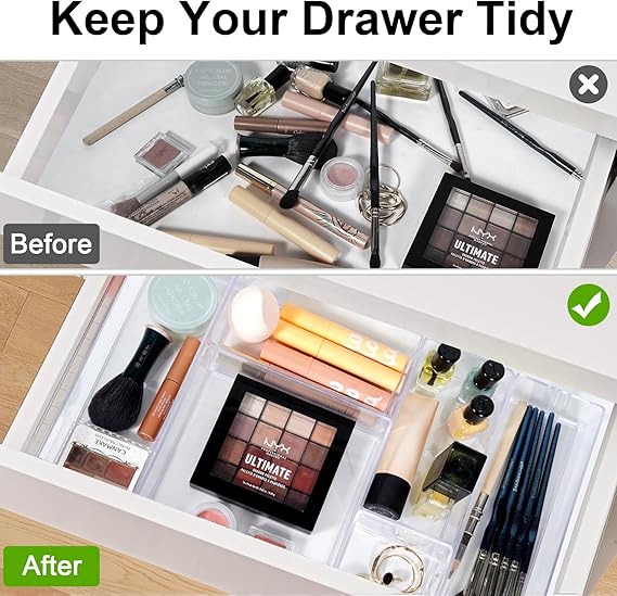 Q285 Juego organizador de cajones de acrílico apilable, 18 cubos de almacenamiento de varios tamaños Diseño apilable y que ahorra espacio: cada organizador está diseñado para ser apilable, lo que permite un fácil almacenamiento en cajones, armarios o en estantes. El diseño compacto los hace perfectos para espacios pequeños y te ayuda a mantener tus pertenencias ordenadas y organizadas. Calidad alimentaria: este juego organizador de cajones de 6 piezas está hecho de plástico transparente de primera calidad, sin BPA, proporcionando una solución duradera y duradera para organizar tu espacio. Estos organizadores están diseñados para durar y mantener tus artículos ordenados. Múltiples tamaños: ideal para organizar maquillaje, joyas, suministros de oficina, artículos esenciales de baño y utensilios de cocina. Los contenedores de varios tamaños se pueden utilizar en cajones, encimeras o estantes para maximizar tu potencial de almacenamiento en cualquier habitación. Fácil de limpiar y mantener: con su diseño transparente, estos organizadores le permiten encontrar rápidamente lo que está buscando, reduciendo el desorden. La superficie lisa y fácil de limpiar hace que el mantenimiento sea simple, manteniendo tu espacio fresco y organizado. Perfecto para maquillaje y suministros de oficina: Los organizadores son ideales para almacenar paletas de maquillaje, pinceles y cosméticos. También funcionan bien para suministros de oficina como bolígrafos, lápices y clips. Mantén tu espacio de trabajo o área de tocador libre de desorden y organizada con facilidad. Enviamos a toda la republica pago contra entrega. Aceptamos tarjeta de crédito y debito.