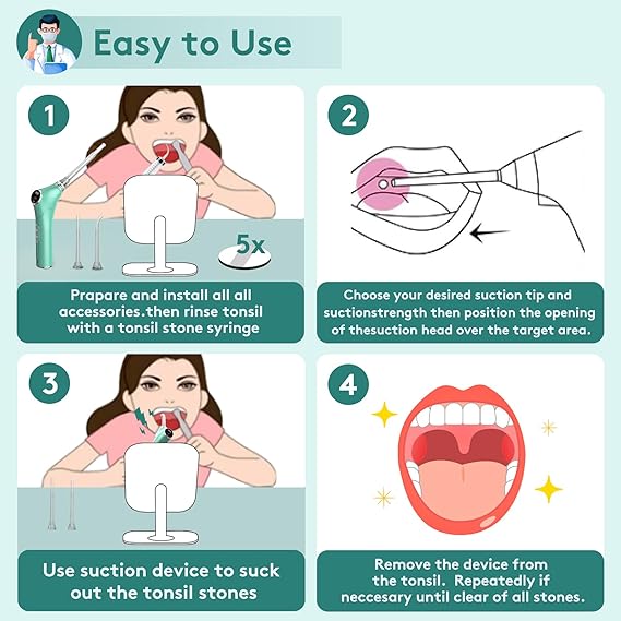Q510.00 Kit electrónico de eliminación de piedras amígdalas al vacío, removedor de piedras de amígdalas. Kit electrónico de eliminación de piedras tonílicas: recibirás un removedor electrónico de piedras amígdalas, 3 sondas de succión, 5 espejos de aumento, depresor de lengua de acero inoxidable, una jeringa de piedra de amígdala, un cable USB, manual de usuario (idioma español no garantizado). Este removedor eléctrico de piedras de amígdalas al vacío específicamente diseñado es una excelente manera de eliminar las molestas piedras de amígdalas en casa. Es la eliminación sin esfuerzo del mal aliento y otros problemas orales 3 modos de succión ajustables: este dispositivo de vacío para eliminar piedras de amígdalas con 3 modos de succión ajustables (suave → moderado → fuerte) Pulsa el botón de modo (tecla M) para cambiar de modo, puedes elegir qué modo de acuerdo a tus necesidades. Recomendamos primero enjuagar las amígdalas con una jeringa de piedra amígdala llena de agua tibia. Enjuague hasta que las piedras de las amígdalas sean visibles, luego proceda con succión 3 sondas de silicona suave: esta herramienta de eliminación de piedras de amígdalas viene con sondas de silicona ultra suaves de grado alimenticio, 3 tipos diferentes de sondas de extensión dirigidas a diferentes posiciones y diferentes tamaños de piedras de amígdalas de manera eficaz y proporcionan un punto de contacto cómodo y seguro Luz guía LED integrada: este limpiador de piedras de amígdalas viene con una luz LED integrada que ilumina las zonas ciegas, lo que te da una visión más clara del área de operación para que puedas extraer suavemente las piedras de amígdalas Eliminación de piedras tonílicas al vacío eléctrica mejorada: este kit de eliminación de piedras de amígdalas es fácil de usar para una limpieza clara y completa que es segura y suave para tus amígdalas. ¡Puedes extraer fácilmente esas piedras de amígdalas desagradables y olorosas y poner fin a tu mal aliento! ¡Haz tu vida más agradable!. Enviamos a toda la republica pago contra entrega. Aceptamos tarjeta de crédito y debito.