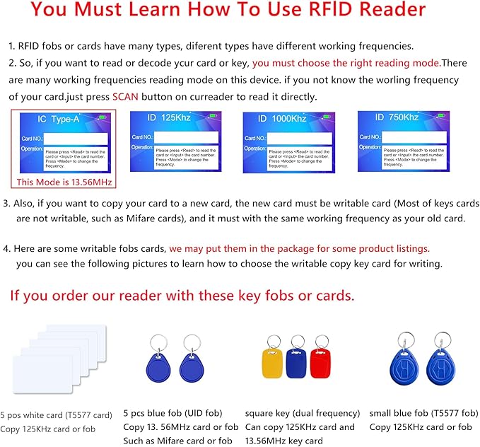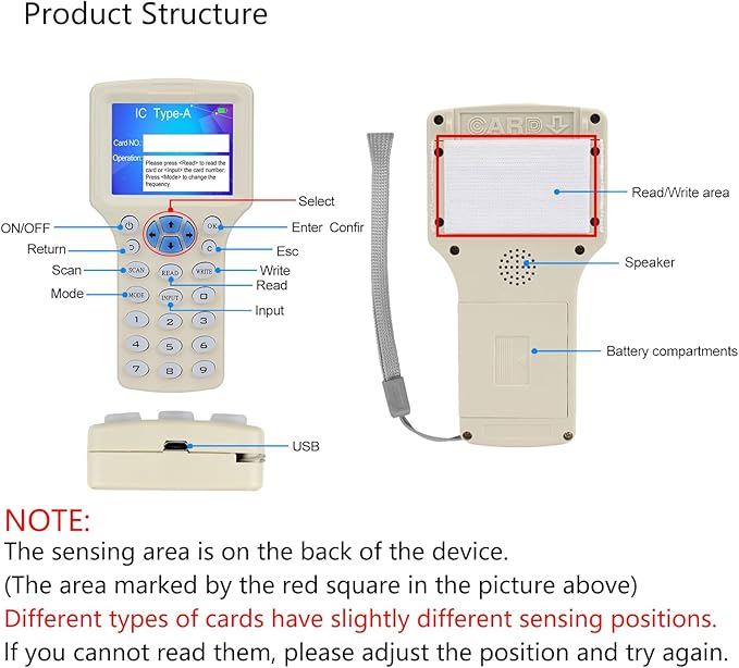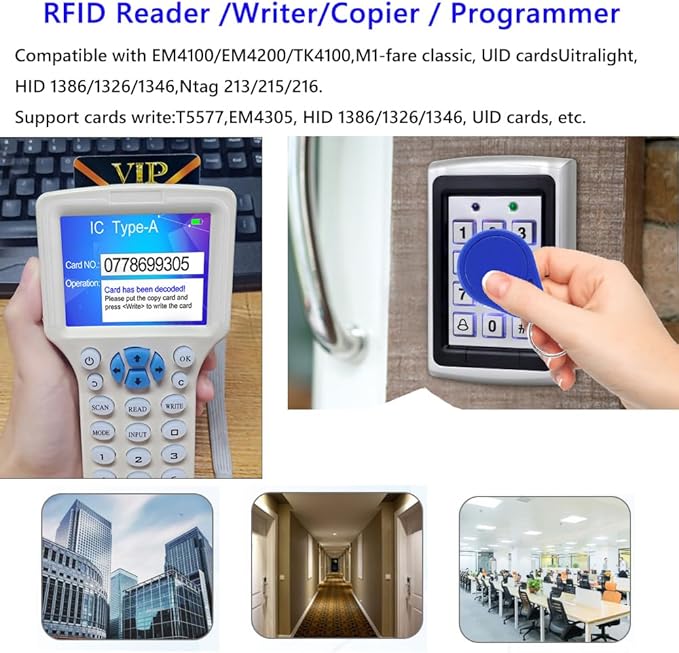 Q425.00 Lector de copiadora, escritor, duplicador, lector de tarjetas NFC, 125 KHz, 13,56 MHz. Combina con varios tipos de tarjetas: compatible con tarjetas ISO 14443 A, tarjeta EM, Mi-fare Classic, tarjeta AWID, tarjeta T5577, Ntag 213/215/216, etc. Este dispositivo solo puede funcionar para parte de tarjetas HID de 125 KHz. Si solo quieres usarlo para leer tu tarjeta HID, considera cuidadosamente Compatible con 10 tarjetas de frecuencia: soporta frecuencia de escritura de lectura: 125 KHz, 250 KHz, 375 KHz, 500 KHz, 625 khz, 750 kHz, 875 KHz, 1000 KHz, 13,56 MHz (ISO1443A/B), etc Tarjeta cifrada: nuestro lector puede descifrar la mayoría de tarjetas de cifrado de 13.56 MHz. (Por favor, asegúrate de que esta operación debe conectar el lector a la computadora) Pantalla inteligente e interfaz USB: pantalla HD a todo color de 2.8 pulgadas, pantalla clara, multilingüe integrado. Con interfaz USB, puedes conectarlo directamente al ordenador Recordatorio importante: ① La compatibilidad de nuestro lector es limitada, si tu tarjeta no es del tipo indicado por nosotros, o si no sabes si puedes usarla, ponte en contacto conmigo antes de comprar. ② El área de detección está en la parte posterior del dispositivo. Los diferentes tipos de tarjetas tienen posiciones de detección ligeramente diferentes. Si no puedes leerlos, ajusta la posición e inténtalo de nuevo. Enviamos a toda la republica pago contra entrega. Aceptamos tarjeta de crédito y debito.