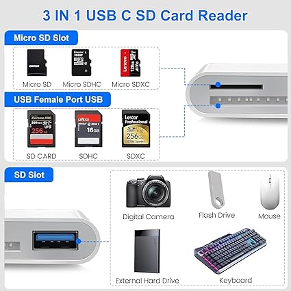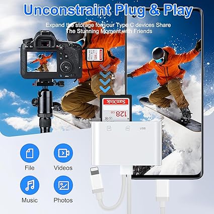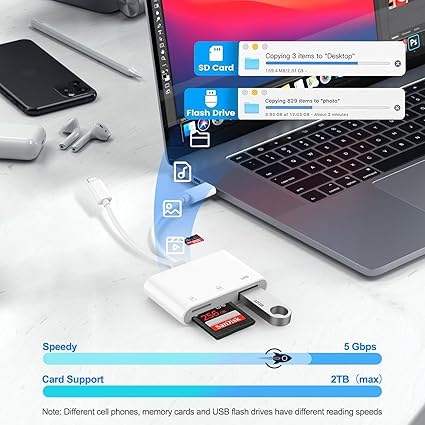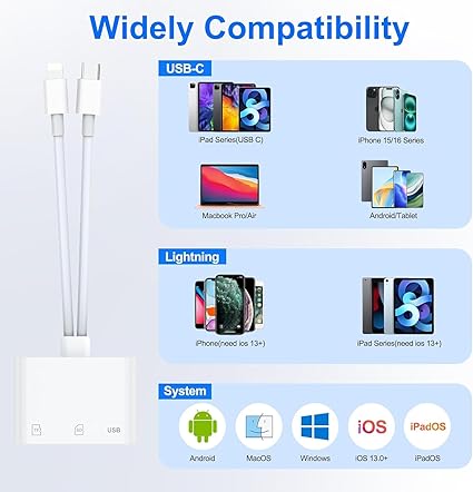 Q135 Lector de tarjetas SD para iPhone, iPad, adaptador de tarjeta SD USB C Lightning de doble puerto Lector de tarjetas SD para iPhone: el lector de tarjetas SD actualizado tiene conectores duales (usb c y lightning), para Apple iPhone 5-14, iPhone 15-16, iPad, Mac, teléfono andriod, dispositivos tipo C de mesa. Nota: dos conectores no se pueden utilizar simultáneamente Transmisión rápida bidireccional: la velocidad de transferencia de la tarjeta SD a iPhone es de hasta 20 MB/s ~ 30 MB/s. El sistema iOS 9.2-12.4 solo admite transmisión unidireccional. El sistema iOS 13.0 o superior admite transmisión bidireccional. Tarjeta SD/TF/CF Importe los datos en el teléfono móvil/PAD, o exporte los archivos en el teléfono móvil/PAD a la tarjeta SD/TF/CF. Incluyendo películas, música, Word, Power Point, Excel, PDF, etc. Lectura y escritura simultáneas: Plug and play, admite intercambio en caliente, lee disco U + tarjeta SD o disco U + tarjeta TF al mismo tiempo, no puede leer dos tarjetas de memoria SD/Micro SD al mismo tiempo. Antes de usar el sistema Android, verifique si la función OTG está activada en la configuración del teléfono. Ampliamente compatible: el adaptador de cámara digital para iPhone es versátil y se puede utilizar ampliamente en varias tarjetas SD, tarjetas Micro SD y dispositivos USB, incluyendo cámaras digitales, cámaras de acción, grabadoras de conducción, unidades flash USB, teclados MIDI, ratones, unidades flash USB, concentrador, teclado electrónico, batería, interfaz de audio, mezclador, monitor, micrófono USB, etc. (la corriente máxima del equipo periférico no supera los 500 mA) Visor de tarjetas SD/Micro SD: El lector de tarjetas SD micro sd le permite ver múltiples tipos de tarjetas SD/TF/SIM fácilmente en cualquier momento y en cualquier lugar. Compatible con tarjeta SD, SDHC, SDHC, SDXC, Micro SD, Micro SD, Micro SD, Micro SDHC, Micro SDXC. Enviamos a toda la republica pago contra entrega. Aceptamos tarjeta de crédito y debito.