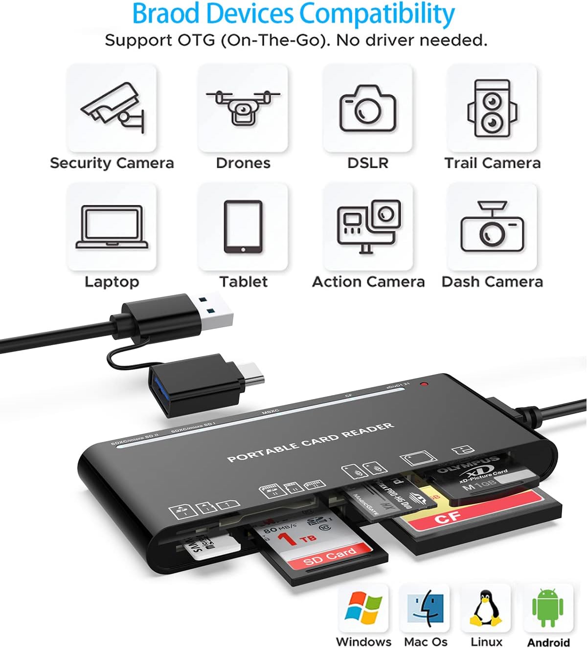 Q265.00 Lector de tarjetas USB C USB3.0 para tarjetas SD, CF, Micro SD, XD, MS – Hub adaptador 7 en 1. Lector de tarjetas 7 en 1: este lector de tarjetas de memoria múltiple satisface tus necesidades de casi todas las tarjetas. Hay 1* ranura CF, 2* SD, 1* TF, 1* Micro SD, 1* XD, 1* MS a su elección y conveniencia. Además, este lector de tarjetas puede leer y escribir 5 tarjetas diferentes al mismo tiempo, lo que puede mejorar enormemente la eficiencia de su trabajo. Diseño 2 en 1: el diseño de conector USB C y USB 3.0 proporciona un acceso más eficiente a laptops, tabletas y teléfonos mediante ranura USB-A o USB-C. Enchufe para jugar, fácil de operar y no necesita controlador adicional. Compatible con la mayoría de los sistemas: Mac OS, Android, Linux, Chrome OS, Windows XP/Vista/7/8/8.1/10,11, etc. Transferencia de velocidad de 5 Gbps: transferencia de datos de 5 Gbps, terminada en un abrir y cerrar de ojos. Puede transferir sus imágenes y videos de su tarjeta a la computadora pronto, ahorrar mucho tiempo y mejorar la eficiencia de su trabajo. También el lector de tarjetas USB3.0 es compatible con el puerto USB2.0/1.1. Amplia compatibilidad con tarjetas: este lector de tarjetas USB C y USB3.0 es compatible con tarjetas CF, CF de alta velocidad (UDMA), tarjeta SD, SDXC (hasta 2 TB), SDHC, micro SD, micro SDXC, micro SDHC, TF, MS, tarjetas de memoria XD, etc. 【Buena calidad y garantía sin preocupaciones】Hecho de buenos materiales y probado para miles, puedes utilizar este lector de tarjetas durante mucho tiempo sin problemas. Y proporcionamos un servicio sin preocupaciones de 12 meses y garantía de garantía. Enviamos a toda la republica pago contra entrega. Aceptamos tarjeta de crédito y debito.