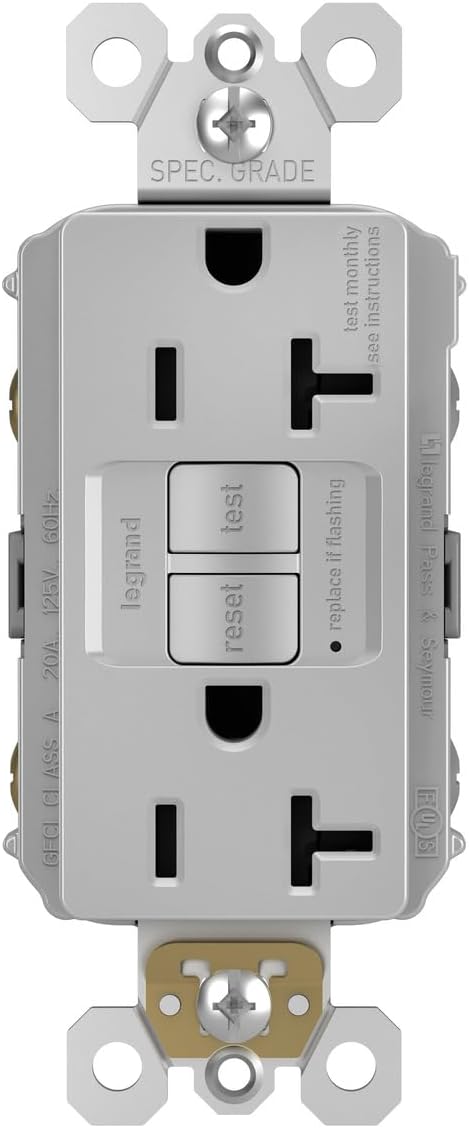 Incluye: 1 salida Legrand – Pass & Seymour gris gfci con salida gfci de autoprueba y salida gfci de 20 amperios, placa de pared sin tornillos incluida