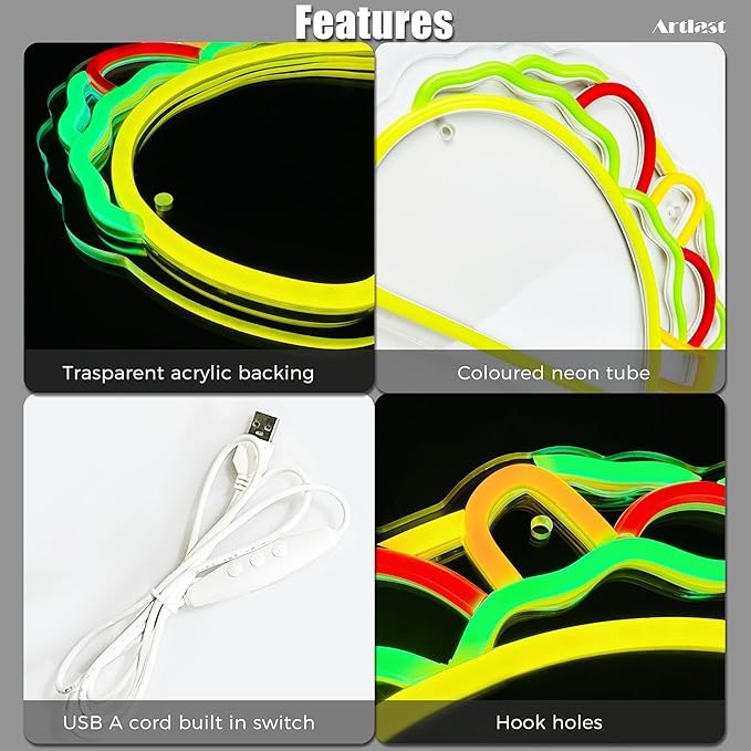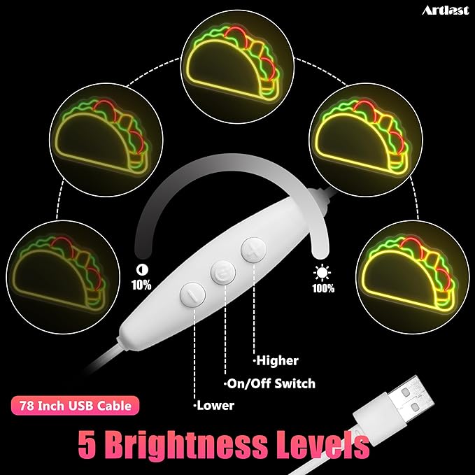 Interruptor regulable: lo que distingue a este letrero de neón es su función de interruptor regulable, lo que le permite controlar el brillo de acuerdo con su preferencia y estado de ánimo. Ya sea que desees un brillo sutil o una iluminación vibrante, este letrero de neón se dobla a tus deseos sin esfuerzo. Ilumina tus noches con un ambiente cálido y acogedor que enciende los antojos de tacos y crea el ambiente perfecto para una fiesta de tacos o celebración del martes de tacos.