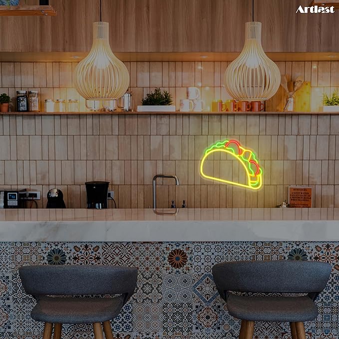 Decoración vívida de tacos: fabricado con brillo puro, este letrero de neón cuenta con un diseño impresionante que muestra bellamente las icónicas conchas de taco, perfectamente texturizadas e irresistiblemente apetitosas. Sus colores vivos y su impecable atención al detalle lo convierten en un punto focal en cualquier habitación, ya sea tu hogar, restaurante o incluso una barra de tacos.