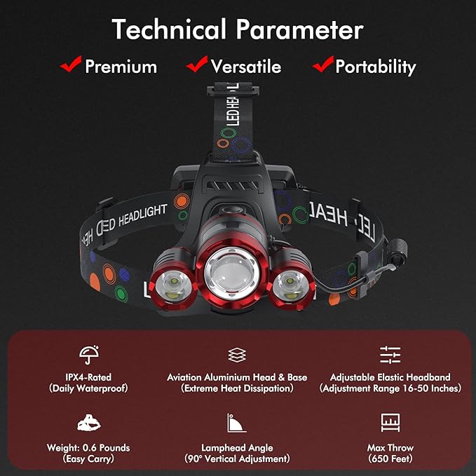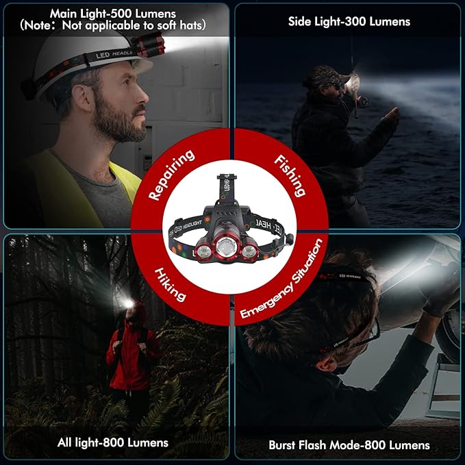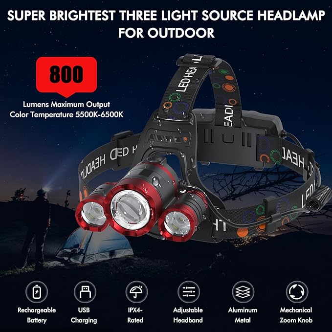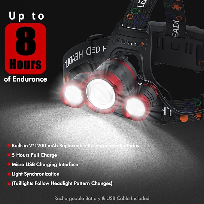 Q325.00 Linterna frontal recargable de 1200 lúmenes, súper brillante, 4 modos. Ligero y portátil y libera tus manos: la diadema está hecha de material TPU altamente elástico y respetuoso con el medio ambiente, que se puede ajustar de 11 a 22 pulgadas. Las bandas ajustables del sistema proporcionarán la máxima comodidad. Eso se equilibra perfectamente entre la parte delantera y trasera de la cabeza. Solo 0.6 libras, que la mayoría de las veces olvidas que llevas uno. Para mantenimiento del automóvil, camping, espeleología, correr, caminar por la noche, escalada de montaña, pesca, exploración, lectura nocturna, etc. 4 modos de iluminación y batería recargable de gran capacidad: este faro tiene 4 modelos de iluminación: luz principal, luces laterales, toda la luz, luz estroboscópica lista para emergencias. Utiliza diseño USB, equipado con dos baterías recargables de 1200 mAh, puede durar 6-8 horas después de cargar completamente. La caja de la batería está hecha de material ABS ignífugo, ligero y apretado. Esta luz LED móvil más brillante está preparada para ajustarse a una gama completa de necesidades de iluminación. Lámpara frontal ajustable 3T6 súper brillante: nuestra linterna frontal recargable utiliza 3 bombillas LED T6, más brillante y vida útil más larga de lo que nunca pensaste posible, máximo hasta 6000 lúmenes. Y la luz principal tiene la función de zoom telescópica y se puede ajustar verticalmente en 90°. Puedes tener un faro LED fiable, manos libres, y proyectar luz brillante y potente de la manera que desees, iluminar. Atando todos los lugares oscuros. IPX4 impermeable para uso en exteriores: los faros son impermeables IPX4 y pueden resistir salpicaduras y lluvia. Esta parte de la lámpara utiliza aleación de aluminio de grado industrial; el aislamiento térmico y el efecto de disipación de calor son muy buenos, el uso prolongado no se sobrecalentará. Allí para asegurarse de que su luz permanezca encendida incluso cuando la lluvia está empapando. Cuando compres nuestro faro, recibirás dos faros, cuatro de las baterías de 1200 mAh, un manual de usuario (idioma español no garantizado) y dos cables de carga USB. Si tienes algún problema, ponte en contacto con nosotros a través de Amazon, el servicio de atención al cliente en línea 24* 7 te dará el servicio postventa más perfecto. Enviamos a toda la republica pago contra entrega. Aceptamos tarjeta de crédito y debito.