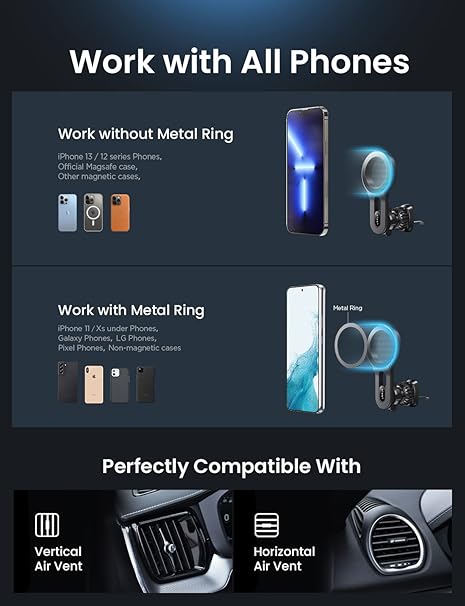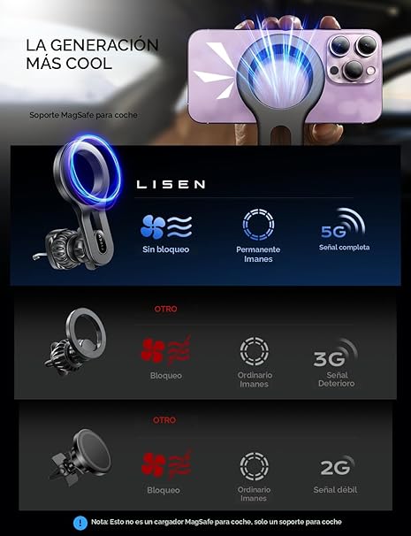 Q225.00 LISEN Soporte magnético para teléfono MagSafe para automóvil, soporte para teléfono con ventilacion Soporte experto apto para MagSafe: Soporte magnético para teléfono para automóvil con función sin bloqueo/Magsafe está diseñado para crear el estado de ánimo perfecto para la experiencia de cada conductor. Con brazo de extensión y ajuste de ángulo libre, pueden crear un ambiente cómodo, o un ambiente de conducción vívido, brillante y refrescante, que se adapta mejor a tu automóvil. Nota: Compatibilidad magnética: Requiere iPhone 12 o modelos compatibles con MagSafe o fundas magnéticas de terceros (los dispositivos Android requieren placas magnéticas autoinstaladas) Más estable y menos bloqueo: LISEN ha actualizado este soporte de ventilación Magsafe para automóvil desde 3 direcciones. ① Brazo de extensión mejorado para proteger el choque por sobrecalentamiento de tu teléfono; ② Soporte de teléfono celular para montaje en automóvil con el “gancho de acero”; ③ Soporte magnético para automóvil que tiene la fuerza magnética más fuerte, que puede contener hasta 10 iPhone 14 Pro Max. LISEN proporciona al menos 1 año de servicio al usuario. Los modelos de automóviles incompatibles como a continuación: Mercedes Clase A, Mercedes Clase C, Smart, W213 benz Clase E Protege tu teléfono y ventilación: el soporte de teléfono para ventilación de automóvil está hecho de silicona. Protegerá tu teléfono celular y ventilación de automóviles de arañazos. Disfruta de navegar, llamar, hablar o escuchar música fácilmente en este soporte para automóvil. Nota: ① Confirme antes de comprar: el producto no es compatible con vehículos con cuchillas de ventilación redondas o de forma única. Alerta de abrazadera: Asegúrese de que la cuchilla de ventilación tenga un grosor de < 0,15 pulgadas para el agarre ② Evita la fuerza de rotación excesiva en la perilla de ajuste para prolongar la vida útil Compatible con rejillas de ventilación horizontales y verticales: el soporte para teléfono de automóvil mejorado incorpora una abrazadera de gancho de acero un 50% más larga en comparación con los modelos estándar. Este mecanismo de sujeción rediseñado, desarrollado específicamente para sistemas de ventilación horizontal y vertical de vehículos, tiene como objetivo mejorar los desafíos en todo el mercado relacionados con la adaptabilidad de la ventilación y la estabilidad del soporte. La compatibilidad mejorada con configuraciones de ventilación estilo rejilla se logra a través de una presión de sujeción ajustable Como empresa responsable, Lisen opera de manera sostenible, con altos estándares ambientales y sociales. Continuamos incorporando la sostenibilidad cada vez más profundamente en la forma en que hacemos negocios, en nuestras propias operaciones y más allá, junto con nuestros proveedores. Nuestro equipo de expertos siempre está a su lado. Sobre el problema compatible: 1. No compatible con rejillas de ventilación redondas. 2. No es compatible con cuchillas de más de 1.34 pulgadas de ancho. 3. el producto funciona únicamente como soporte y no admite carga inalámbrica. Enviamos a toda la republica pago contra entrega. Aceptamos tarjeta de crédito y debito.