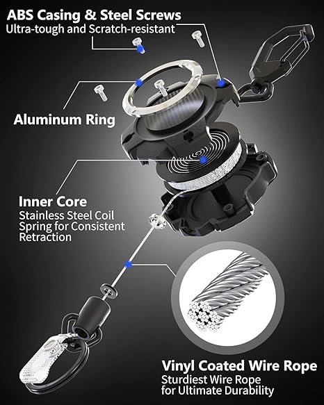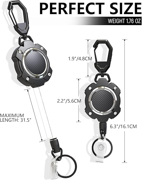 Llevar hasta 15 llaves: Nuestro sistema de carrete único con cuerda de alambre de alta resistencia presenta una fuerza de rebote más fuerte que puede soportar 8 oz. de tensión, unas 15 llaves, perfecto para el uso diario y para llevar llaves cuando viajas.