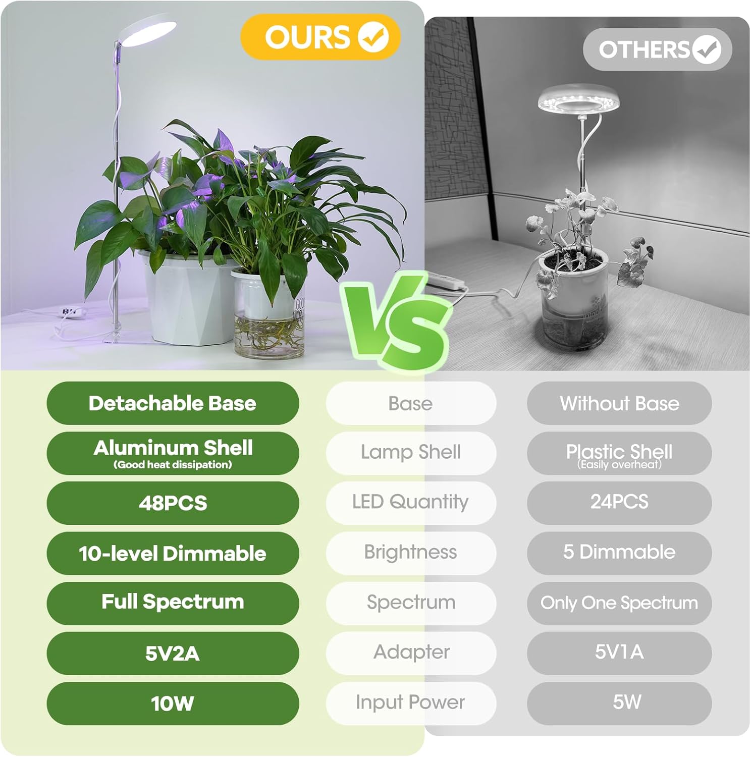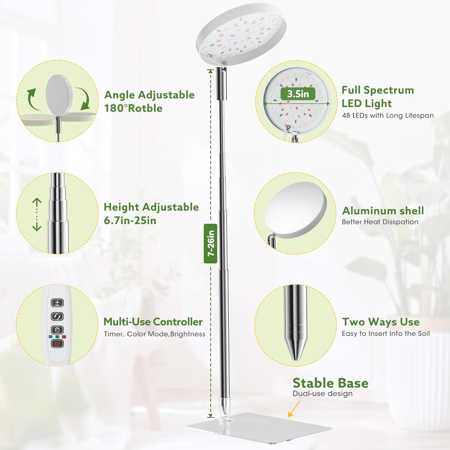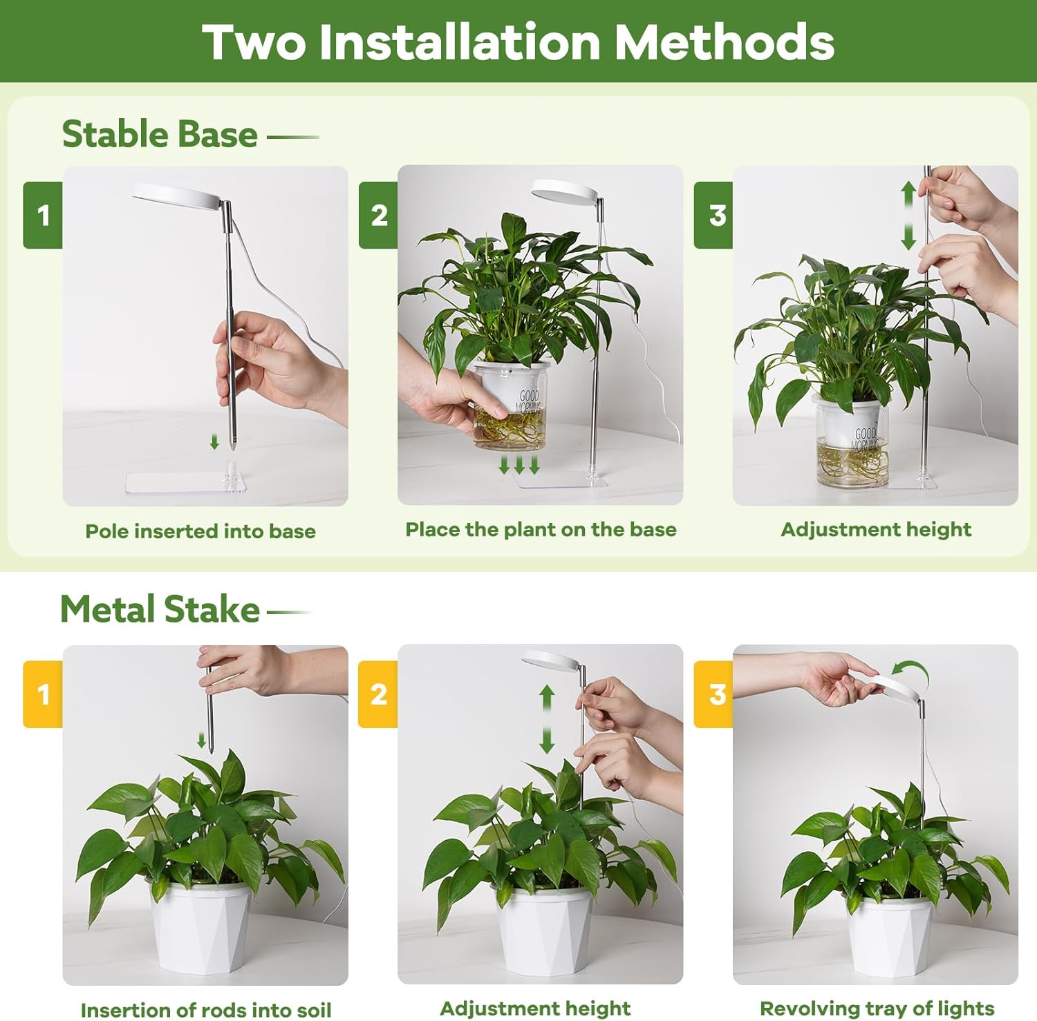 🌱【Luz de crecimiento mejorada 2024】Nuestra luz de cultivo de plantas de interior cuenta con un diseño de base desmontable, que ofrece dos prácticos métodos de instalación. Coloca la maceta en la base para mayor estabilidad (ten en cuenta que no puede estar sola), o simplemente inserta la luz de cultivo directamente en el suelo, ¡no requiere herramientas! Su diseño compacto es perfecto para escritorios, mesas y estantes de plantas, maximizando tu valioso espacio.