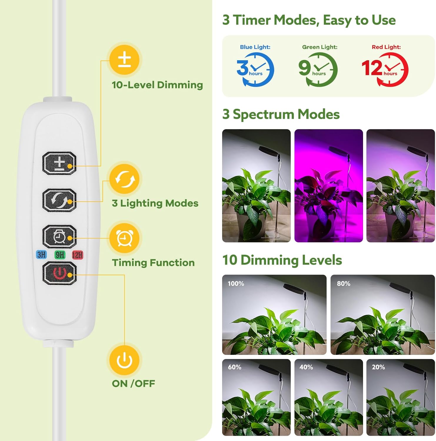 🌱【10 lámparas de crecimiento con temporizador automático y brillo adaptable】Con brillo que va del 10% al 100%, cumple con los requisitos de iluminación para diferentes etapas de crecimiento de plantas. Diseñada con tres ajustes de tiempo (3/9/12 horas), esta lámpara para plantas de interior se enciende y apaga automáticamente a diario cuando se enchufa, eliminando la necesidad de ajustes manuales. Práctico y sin complicaciones.