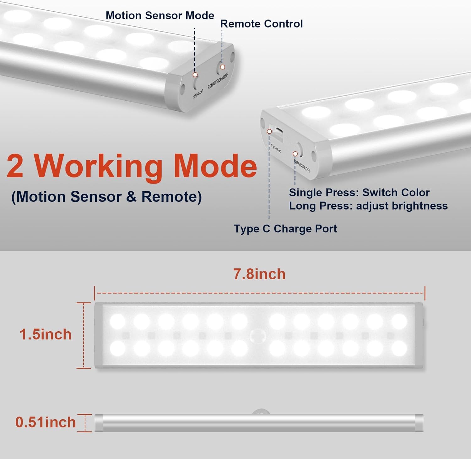 Luces de gabinete con sensor de movimiento mejoradas con control remoto: la iluminación debajo del gabinete tiene 2 modos: sensor de movimiento (modo nocturno y modo día)