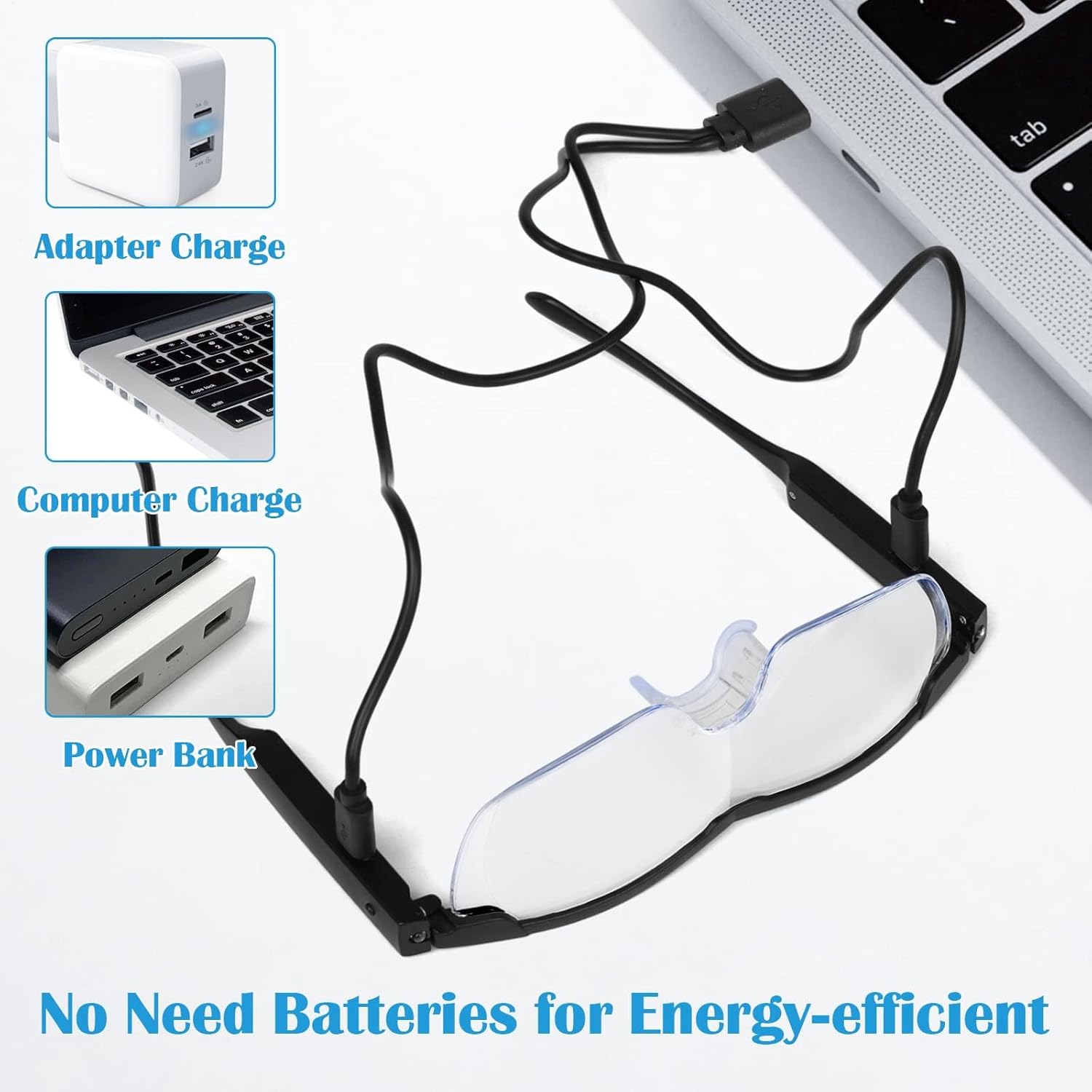 Batería recargable USB de alta eficiencia: las lupas se pueden encender con el cable de carga incluido. Ya no necesita comprar baterías, lo que reduce el peso y ahorra dinero y energía. La carga es rápida y fácil, y las gafas se pueden cargar completamente en solo 1.5 horas.