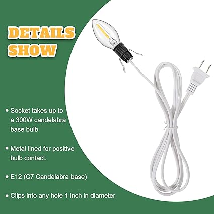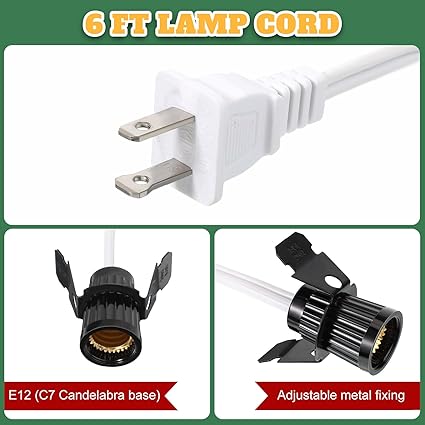 Q295 Macarrie 12 cables de lámpara con clip con enchufe de luz E12, cable de repuesto para lampara Ampliamente aplicados: estos enchufes de luz con cables son adecuados para decoraciones de Navidad, lámparas, casas de pueblo de Navidad, fiestas de cumpleaños, árboles de cerámica de festivales, calabazas, decoraciones de Halloween, moldes de soplado, bodas, proyectos de proceso y linternas de papel Instalación y uso fácilmente: todo el reemplazo del enchufe de la lámpara es de 6 pies de largo para un posicionamiento flexible, con enchufe E12 (base de candelabro C7) para sujetar en el agujero de aproximadamente 1 pulgada de diámetro, clip de metal ajustable para adaptarse al interior de la lámpara, asegurando la bombilla y la carcasa de la bombilla a la lámpara para una mayor vida útil Contactos positivos más grandes: los reemplazos del cable de la lámpara requieren bombillas de base de vela de hasta 300 W y tienen un forro de metal para entrar en contacto con el contacto positivo de la bombilla, se puede utilizar con confianza Satisface las necesidades de uso y reemplazo: recibirás 12 piezas de repuesto de cable de lámpara con enchufes, se pueden aplicar a linternas de Halloween, pueblo de Navidad, faroles de sal de cristal para añadir un ambiente festivo. Enviamos a toda la republica pago contra entrega. Aceptamos tarjeta de crédito y debito.