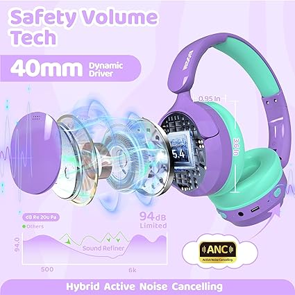 Tranquilidad de los padres: incluye pegatinas de dibujos animados y guía para padres. Servicio al cliente basado en Estados Unidos (respuesta las 24 horas). Fácil emparejamiento Bluetooth con iOS, Android, PC y tabletas. ANC ayuda al enfoque de aprendizaje.