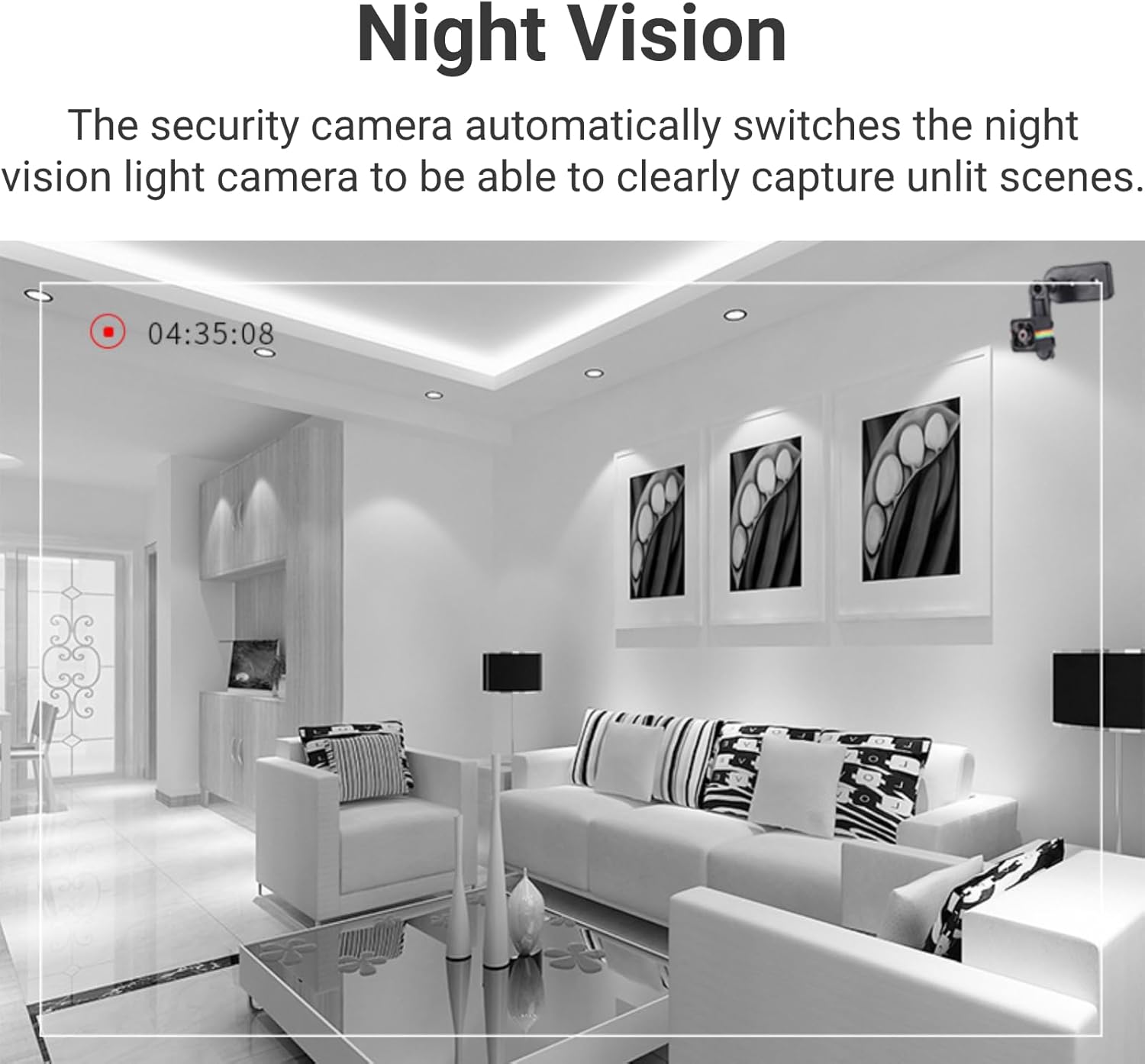 Uso de larga duración: equipada con una batería de 200 mAh, esta cámara de seguridad puede durar hasta 50 minutos. También se puede conectar a una batería de 10000mAh (no incluida) para un tiempo de grabación de hasta 30 horas.