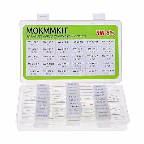 Q185 MOKMMKIT Kit de resistencias de cemento cerámico de 30 valores y 60 piezas, 5W de resistencia Nombre del producto: Kit de resistencia de cemento cerámico MOKMMKIT 5W El kit incluye modelos: 100 ohm//150 ohm//200 ohm//300 ohm//470 ohm//500 ohm//620 ohm//750 ohm//820 ohm//1K ohm//2K ohm//3K ohm//3.9K ohm//4.7K ohm//5K ohm//5.6K ohm//6.2K ohm//7.5K ohm//8.2K ohm//9.1K ohm//10K ohm//20K ohm//30K ohm//47K ohm//50K ohm//62K ohm//68K ohm//75K ohm//82K ohm//100K ohm (30 valores 60 piezas 2 piezas por modelo) Material de alta calidad: la resistencia de cemento está hecha de cerámica, cemento y metal de alta calidad, con un bajo coeficiente de temperatura y un buen rendimiento a prueba de explosiones Alto rendimiento: resistencia de cemento Tiene las características de aislamiento, resistencia a la humedad, resistencia al calor, resistencia al impacto y larga vida útil Ampliamente utilizado: televisores, aires acondicionados, computadoras, coches, altavoces, instrumentos, equipos médicos, placas de circuito impreso, adaptadores de corriente, divisores de audio, etc. Enviamos a toda la republica pago contra entrega. Aceptamos tarjeta de crédito y debito.