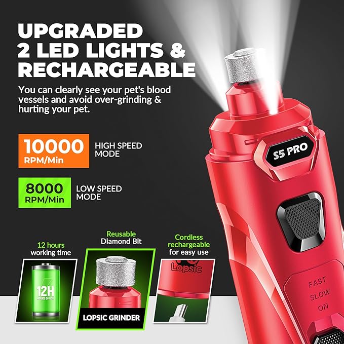 Kit de cortaúñas profesional mejorado para perros: mejora la experiencia de cuidado de las uñas de tu mascota con nuestro kit de molinillo de uñas para perros LOPSIC de alta calidad. Esta versión mejorada viene completa con accesorios esenciales diseñados para un mantenimiento excepcional de las uñas.