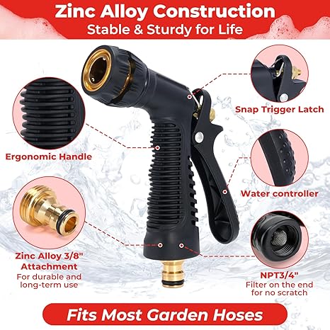 Presión de agua ajustable: ¿Necesitas ir fácil en una parte de tu coche? Todo lo que tienes que hacer es ajustar el agarre de la mano y luego asegurar con el clip de metal en la empuñadura para un funcionamiento manos libres. (Nota: Presión de agua adecuada: 2.5bar-6bar. No es adecuado como lavadora de alta presión. Si la presión del agua es demasiado alta, la pistola pulverizadora podría volverse disfuncional)