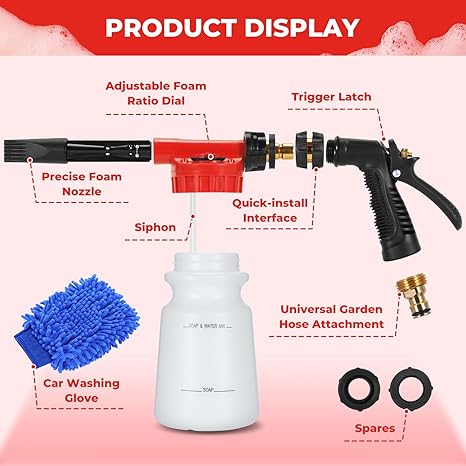 Juego de pistola de espuma multifuncional: ¡Quieres que tu coche dure mucho tiempo y eso también va para tus herramientas! Haz la elección correcta con esta pistola de espuma construida con plástico ABS resistente y aleación de zinc de alta calidad. Equipado con un anillo de sellado de goma, no gotea ni rocía incorrectamente. Como beneficio adicional, incluimos guantes de lavado de autos para completar tu kit de limpieza. Perfecto para su uso en automóviles, motocicletas, ventanas, aceras, entradas de vehículos y mucho más