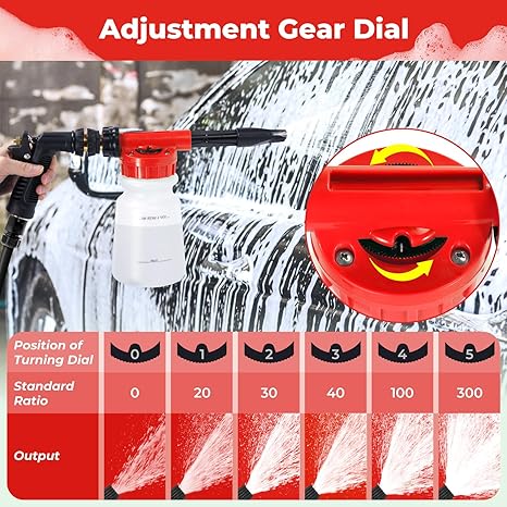 Concentración de espuma ajustable: ¿Cómo se obtiene la cantidad justa de espuma? El rociador de lavado de autos Ohuhu con dispensador de jabón maneja el aerosol de espuma o el spray de agua según sea necesario. Las marcas de medición en el exterior de la botella indican cuánta agua y jabón se necesita. Elige entre 6 niveles de concentración de espuma según tus necesidades, simplemente gira el dial para ajustarlo