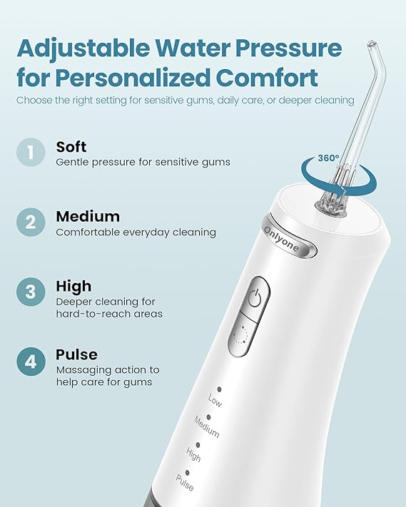 Q265 Onlyone Irrigador bucal de agua inalámbrico recargable con presión de agua ajustable Limpieza profunda personalizada: el hilo dental de agua Onlyone tiene 4 ajustes de presión y 5 puntas para un cuidado personalizado, desde suave a intenso. Cuenta con una función de memoria para guardar tus ajustes y funciona silenciosamente por debajo de 55 dB para un cuidado bucal efectivo y personalizado Depósito de agua grande sin BPA y mejorado de 10.1 fl oz, menos recarga necesaria: nuestro irrigador dental de agua ahora cuenta con un tanque de agua más grande de 10.1 fl oz, el doble de la capacidad de los modelos más antiguos. Con menos necesidad de recargas, hace que tu limpieza oral sea más conveniente y eficiente Batería de larga duración, portátil en cualquier lugar: disfrute de hasta 30 días de uso con una carga de 3 horas con este hilo dental compacto y ligero. Ideal para el hogar o viajes. Viene con un cable USB (adaptador no incluido) para una carga cómoda sobre la marcha Instrucciones de seguridad: Utilice solo un cargador de 5V/1A para una carga segura. Evite los cargadores de terceros que excedan los límites de voltaje o corriente. Cargue en un lugar fresco y seco, lejos de fuentes de calor y no sobrecargue. Enchufa y desconecta el cable de carga suavemente, y asegúrate de que el puerto de carga esté completamente seco con la cubierta impermeable cerrada de forma segura antes de cargar. Enviamos a toda la republica pago contra entrega. Aceptamos tarjeta de crédito y debito.