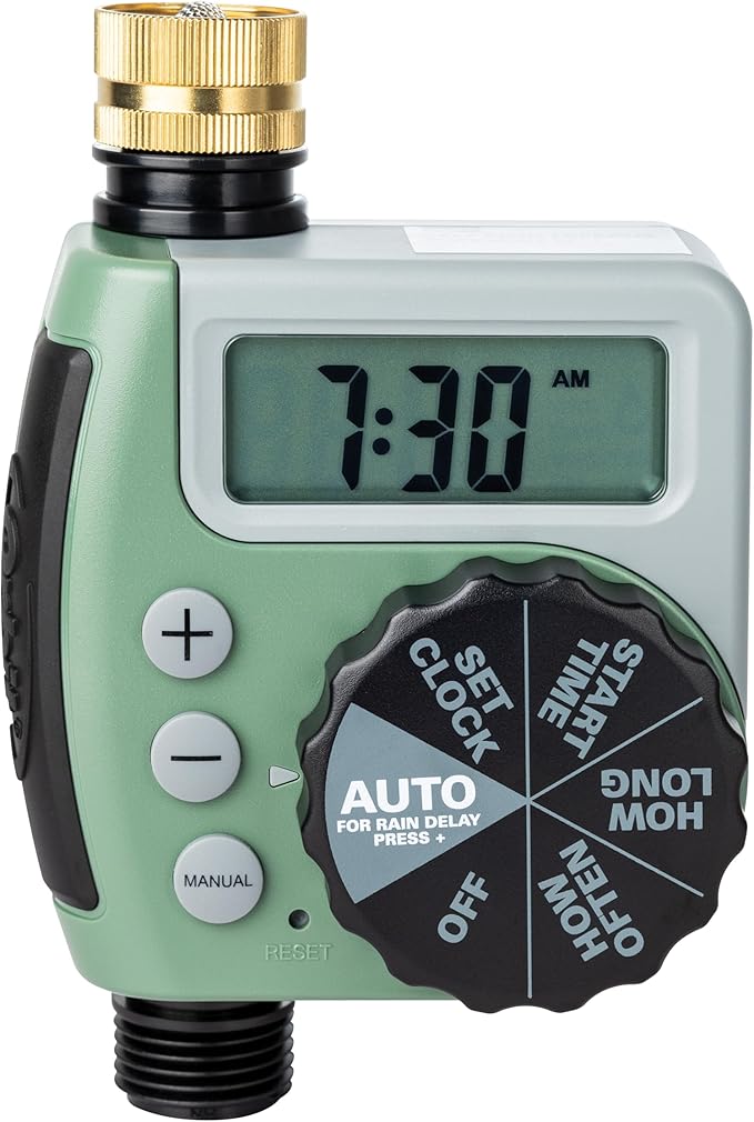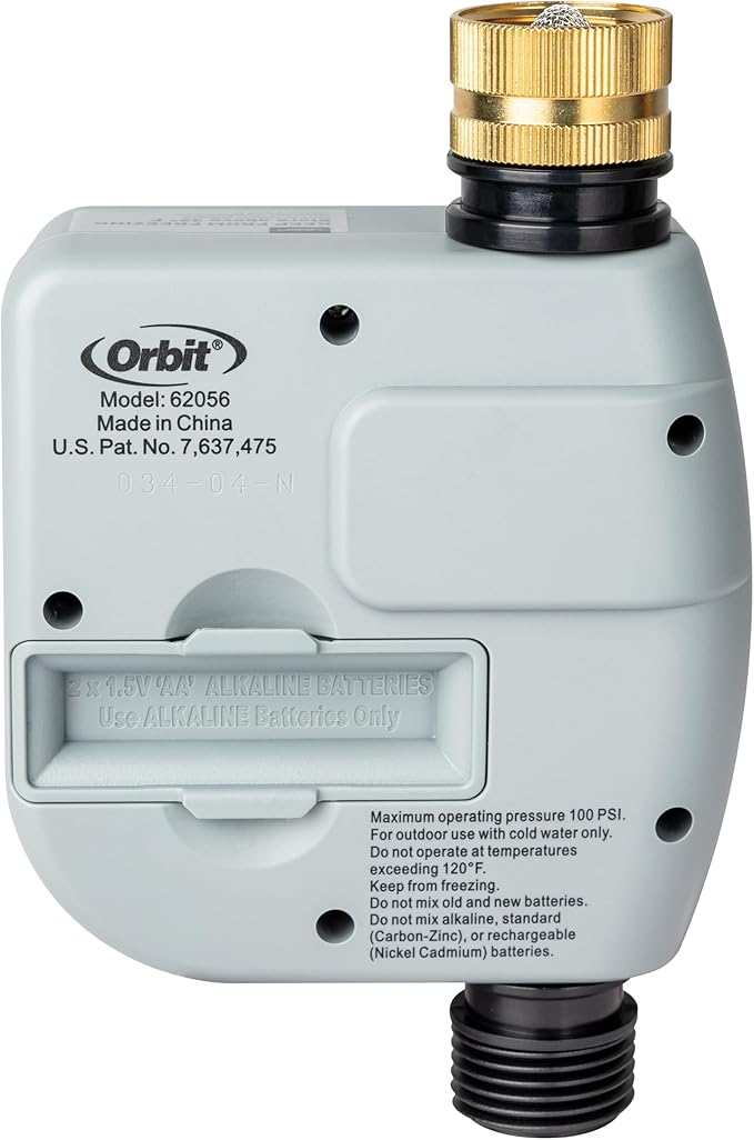 Q365 Orbit – Temporizador de grifo de manguera de una salida con una sola marcación 62056 Funciones de gran tamaño para facilitar su uso y configuración rápida. Construcción resistente a la intemperie con latón giratorio. Función de retardo de lluvia para la conservación del agua (24, 48 o 72 horas). Funciona con dos pilas alcalinas AA (no incluidas). Ahorra agua en condiciones de sequía. Enviamos a toda la republica pago contra entrega. Aceptamos tarjeta de crédito y debito.