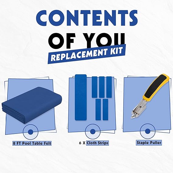 Q425 Paño de billar con 6 tiras de tela y removedor de grapas para mesa de billar, kit de repuesto Contenido del kit de repuesto: 1 fieltro de mesa de billar de 8 pies, 6 tiras de tela, 1 extractor de grapas Dimensiones: adecuado para mesa de billar de 8 pies, fieltro de mesa de billar (104 pulgadas de largo x 57 pulgadas de ancho), tiras de tela (53 pulgadas de largo x 6 pulgadas de ancho) Materiales de fibra de alta resistencia: este mantel de billar está hecho de fibra de poliéster, lo que garantiza una excelente resistencia a la abrasión, lo que permite que la tela resista el uso a largo plazo sin desgastarse fácilmente Enviamos a toda la republica pago contra entrega. Aceptamos tarjeta de crédito y debito.