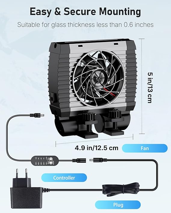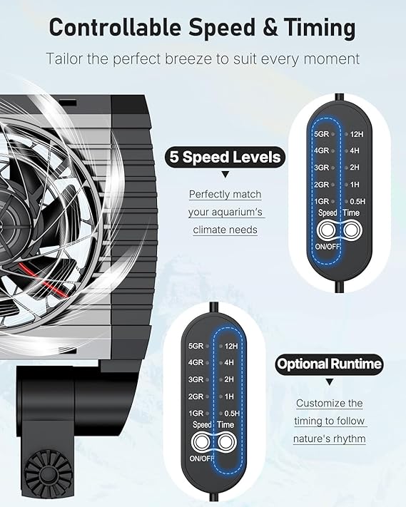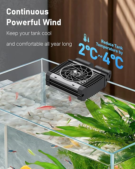 Q225 Pawfly Enfriador de Acuarios, Silencioso, Ventilador con Velocidad Regulable Y Temporizador Fácil instalación: Bien hecho con soportes de alta resistencia y 2 tornillos fuertes para mayor estabilidad. El ventilador enfriador de acuario se puede montar firmemente en el acuario. Perfecto para acuarios de agua dulce y salada con un grosor de cristal inferior a 1,5 CM. Viento fuerte: Con 7 robustas aspas, el silencioso ventilador para acuarios crea continuamente un fuerte viento. Acelera la disipación del calor y reduce la temperatura del acuario entre 2 °C y 4 °C. Ideal para mantener frescos y cómodos a los animales de su acuario durante todo el año Velocidad del viento ajustable: ¡5 niveles de velocidad del viento disponibles! El ventilador para enfriar el acuario puede ajustarse de forma flexible a la velocidad del viento más adecuada. Ajuste siempre el viento más agradable para las distintas criaturas acuáticas en las diferentes estaciones. Función de temporizador: Con el práctico temporizador del controlador, el refrigerador para acuarios puede funcionar durante 0,5 h, 1 h, 2 h, 4 h o 12 h. Puede ajustar manualmente el tiempo de funcionamiento en función de la velocidad del viento y la temperatura del acuario. Enviamos a toda la republica pago contra entrega. Aceptamos tarjeta de crédito y debito.