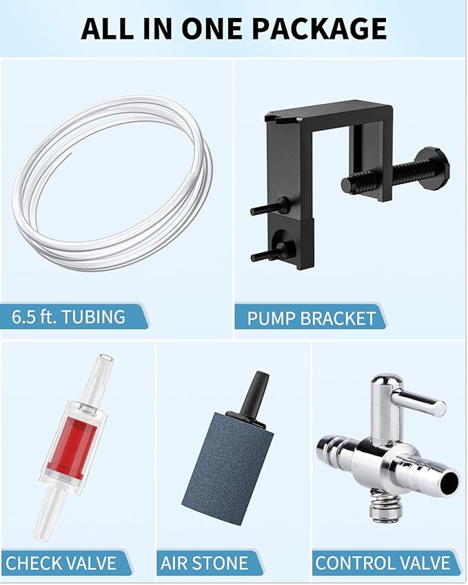 Q185.00 Pawfly Mini bomba de aire de acuario para tanques de peces nano de 3 a 20 galones. Fácil instalación: Pase la columna inferior del soporte a través del gancho de la bomba, luego sujete el soporte en la pared del tanque de peces y gire la perilla para sujetar la bomba firmemente. Compacto y ligero: mide 3.1 pulgadas de largo x 2 pulgadas de ancho x 1.5 pulgadas de alto y pesa 4 onzas. Tamaño perfecto para aireación en tanques de peces pequeños de 3 a 20 galones o cubos DWC para mantener a tus peces saludables. Salida constante: caudal de aire máximo: 15 GPH; Presión: 0,01 MPa; Potencia: 1 W. Un aireador fuerte que resiste el uso prolongado para promover el suplemento de oxígeno constantemente. Aireación silenciosa: con una base de soporte de silicona suave y 4 pies de goma a prueba de golpes para minimizar en gran medida la vibración, reduce el ruido a menos de 35 dB como susurros en una habitación tranquila. Accesorios de la bomba: Incluye un soporte, tubo estándar de línea aérea de 6.5 pies, una piedra de aire, una válvula de control de aire y una válvula de retención. Todos construyen la configuración básica de aireación en su pecera. Enviamos a toda la republica pago contra entrega. Aceptamos tarjeta de crédito y debito.