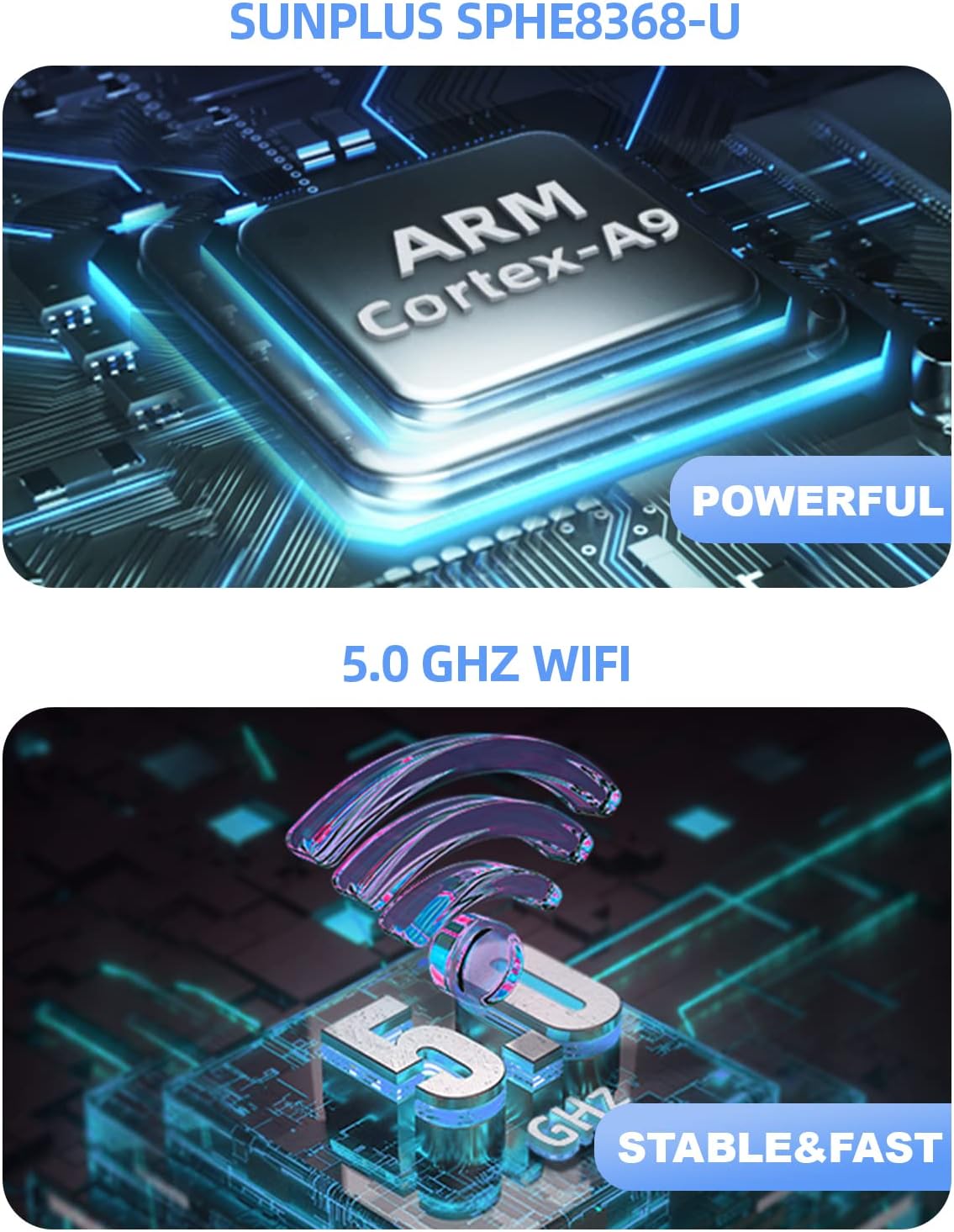 【Potente procesador】: SUNPLUS SPHE8368U, Cortex A9. Tiene un poder de procesamiento más potente, antiinterferencia, y alta estabilidad. El módulo WiFi de 5 GHz incorporado tiene una conexión más estable.