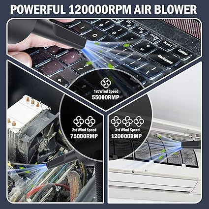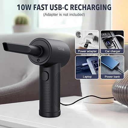 Q385.00 Plumero de aire comprimido – 120000 rpm, 3 velocidades, soplador de polvo inalámbrico de batería. Potente limpieza profunda: la velocidad máxima de rotación del plumero eléctrico inalámbrico es de 120000 RPM, que puede soplar vientos fuertes con una fuerza de 1.9 a 2.6 onzas, produce aire de alta presión continuamente para eliminar el polvo, elimina la suciedad oculta en varios espacios en el teclado o cualquier dispositivo electrónico, extremadamente conveniente de usar en el hogar, la oficina o el plumero del automóvil. Reemplazo perfecto para el plumero de latas de aire: este plumero de aire comprimido se puede cargar repetidamente para reemplazar el polvo de aire comprimido, respetuoso con el medio ambiente, eficiencia energética y ahorrar dinero. En lugar de comprar constantemente aire enlatado Duster, solo necesita invertir una vez para obtener aire comprimido de aire eléctrico permanente. Fácil de usar y portátil: el soplador de aire eléctrico YOMILE está equipado con 3 velocidades de viento ajustables, para las cuales puedes elegir la velocidad adecuada dependiendo del artículo a limpiar, solo es necesario agitar el gatillo para usar. Mide solo 6.3 x 3.9 x 2.6 pulgadas y pesa solo 1.1 libras. Puedes poner fácilmente el pulverizador de aire eléctrico en tu mochila o caja de herramientas y llevarlo a donde lo necesites para el trabajo. Larga duración y carga rápida: el colector de polvo inalámbrico tiene una batería integrada de 7600 mAh, que puede funcionar continuamente hasta 40 minutos. Viene con cable de carga rápida USB-C, completamente cargado en 3-4 horas (el adaptador no está incluido, se puede cargar con cualquier cargador USB) Multiusos: el soplador de aire eléctrico es perfecto para limpiar el teclado de computadora, laptop, cámara, asiento de automóvil y persianas, etc. La boquilla delgada y larga hace que sea más fácil limpiar las esquinas. Los plumeros de aire incluso se pueden utilizar en productos que necesitan ser inflados, como camas inflables, botes salvavidas, etc. Enviamos a toda la republica pago contra entrega. Aceptamos tarjeta de crédito y debito.