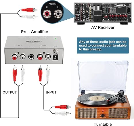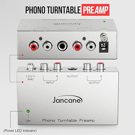 Q165.00 Preamplificador de tocadiscos Phono, preamplificador de fono para tocadiscos Convertir señal de fono: El preamplificador de tocadiscos phono puede convertir señales phono a nivel de línea para un mejor sonido de audio y volumen y le brinda un excelente disfrute de la calidad de sonido. Funcionamiento de bajo ruido: El preamplificador para tocadiscos ofrece un rendimiento excepcional con sus amplificadores operativos de audio de bajo ruido. El uso de este preamplificador giratorio hará que tus discos de vinilo entreguen un sonido exactamente como se lee en la aguja de tu tocadiscos. Entrada RCA y salida RCA/TRS: Este preamplificador phono para tocadiscos tiene entradas RCA estéreo, salidas RCA estéreo y TRS. Conecte el plato giratorio a las entradas RCA y luego conecte el receptor del amplificador a las salidas RCA/TRS (el adaptador de CC de 12 V está incluido). Simple Plug & Play: Conecte el preamplificador phono al equipo de sonido moderno sin entrada fono especializada para amplificar la música. Simplemente Engánchate el preamplificador tanto al tocadiscos como al dispositivo de audio para que puedas disfrutar del vinilo en poco tiempo. Garantía de 1 año: Jancane garantiza este preamplificador de teléfono eléctrico con una política de devolución de dinero de 30 días, sin complicaciones y una garantía del fabricante de 1 año Enviamos a toda la republica pago contra entrega. Aceptamos tarjeta de crédito y debito.