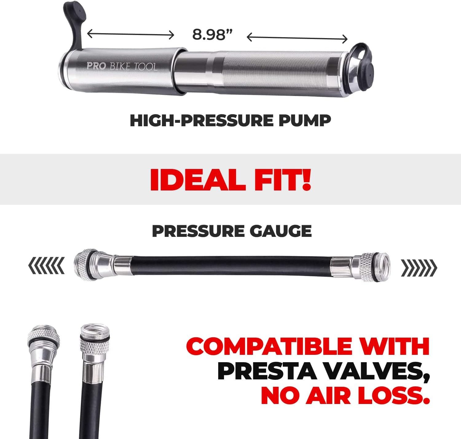 Potencia de bombeo rápido e inflado preciso: alta presión 100 psi / 8.3 bar. El diseño de pistón sobredimensionado permite que esta bomba portátil alcance la presión de conducción con un 30% menos movimientos en comparación con las bombas miniatura de bicicleta convencionales. El diseño de manguera de aire flexible funciona con posiciones de válvula incómodas o ajustadas. Manguera de aire inteligentemente almacenada en el mango para maximizar la compacidad. La manguera cuenta con un manómetro de presión integrado para que puedas bombear con precisión a tu presión de aire deseada.
