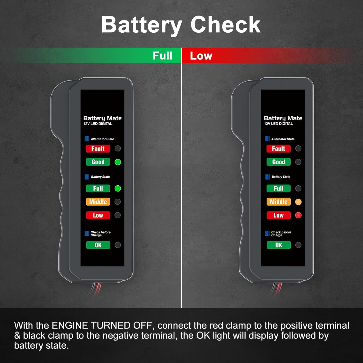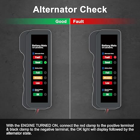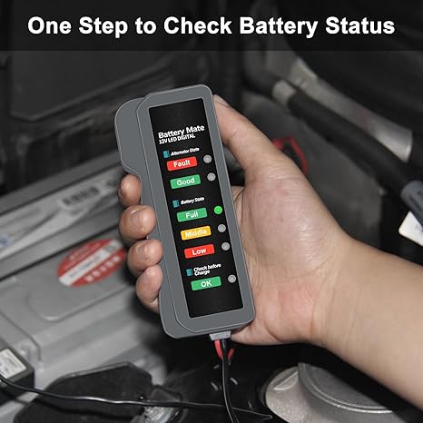 Q185.00 Probador de batería de coche de 12 V y probador de alternador, indicador de probador de carga. [Probador de batería de automóvil] Quizás te preguntes si la batería necesita ser reemplazada o simplemente necesita recargarse. Nuestro comprobador de batería de automóvil le dice el estado de la batería por prueba de batería y alternador. Ahorre su viaje y dinero evitando enviar buenas baterías a los fabricantes de automóviles. Probador de baterías de 12 V: el probador de batería de automóvil es para todos los sistemas de carga de 12 V, incluyendo baterías inundadas regulares, placa plana AGM, espiral AGM y baterías GEL para vehículos, carretillas elevadoras, autos híbridos, SUV, camionetas, barcos, caravanas, motocicletas, remolques de viaje. 6 indicadores LED: el analizador de batería de 12 V es perfecto para uso doméstico y comercial. Seis luces LED muestran el estado de la batería y el alternador, verde significa bueno/lleno, naranja significa medio, rojo significa bajo. Intuitivo, sencillo y claro. No es necesario conocer el voltaje, le decimos directamente la calidad de la batería y el alternador. Diseño duradero: la función de protección inversa evita el desgaste causado por el mal funcionamiento entre el poste de la batería (+) y el terminal del cable (-). El alambre de cobre puro y el clip hacen una excelente conductividad y alta sensibilidad. Diseño antideslizante que te permite usarlo de forma flexible incluso con guantes. [Compra sin preocupaciones] 100% sin preguntas. Si tienes alguna pregunta sobre el probador de batería, envíanos un mensaje a través de Amazon. Nuestro equipo técnico profesional le ayudará a resolver los problemas en 24 horas. Enviamos a toda la republica pago contra entrega. Aceptamos tarjeta de crédito y debito.