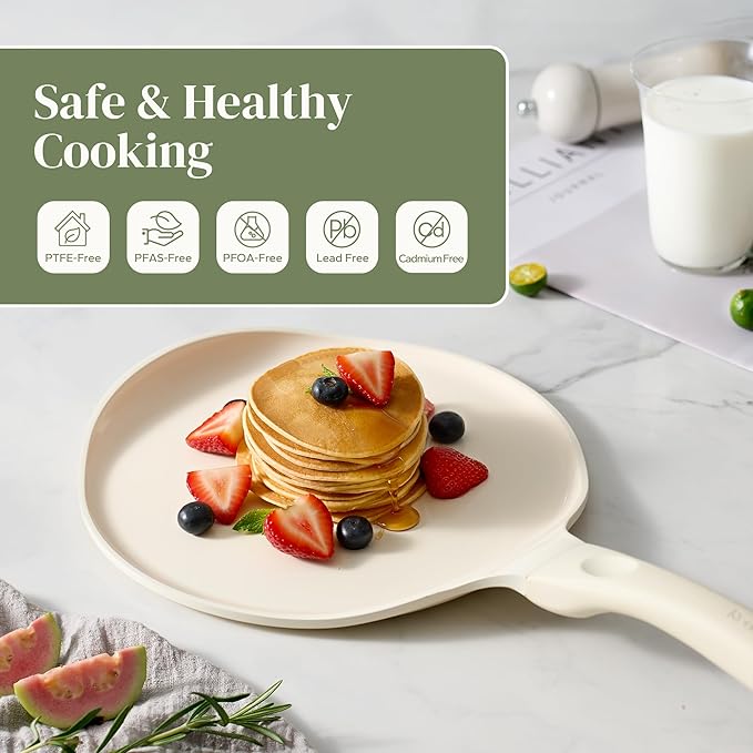 Q320 Redchef – Sartén antiadherente para crepé, de cerámica de 10 pulgadas (color beige) Revestimiento de cerámica antiadherente: la sartén antiadherente de Redchef última intervensión de PFAS y PTFE y PFOA, plomo, cadmio que puede filtrarse en tu comida, lo que los hace seguros para ti, tu familia. Rendimiento multiusos: el crepe antiadherente de 10 pulgadas y la sartén dosa tawa dominan dosis crujientes, crepes delicados, panqueques esponjosos, pasteles de azada y tortillas (comales), ofreciendo resultados excepcionales para todas las necesidades culinarias. Ligero y seguro: pesa solo 1.5 libras, esta sartén plana hace que el crepé se vuelva sin esfuerzo y garantiza un fácil manejo alrededor de la cocina. Mango ergonómico de agarre frío: el mango de baquelita se mantiene fresco cómodamente durante la cocción, con un diseño ambidiestro para un manejo seguro a altas temperaturas. Compatibilidad versátil: esta sartén de cerámica para crepé funciona perfectamente en todas las estufas – inducción, gas, electricidad y cerámica, ofreciendo un calentamiento rápido y uniforme sin puntos calientes. Fácil limpieza: apto para lavaplatos. El revestimiento antiadherente de cerámica libera los alimentos fácilmente para una limpieza rápida, simplemente lavar a mano para mantener el máximo rendimiento. Enviamos a toda la republica pago contra entrega. Aceptamos tarjeta de crédito y debito.