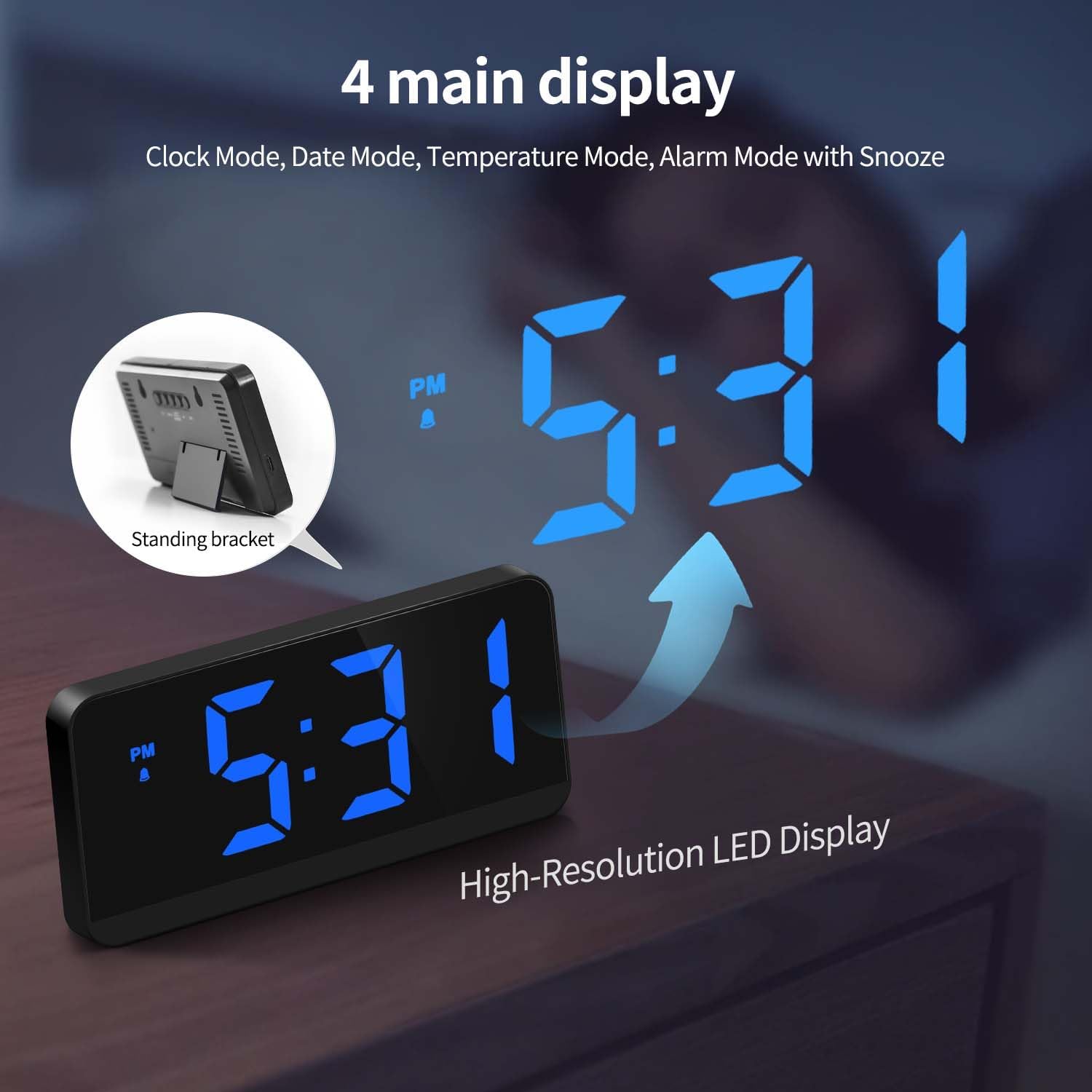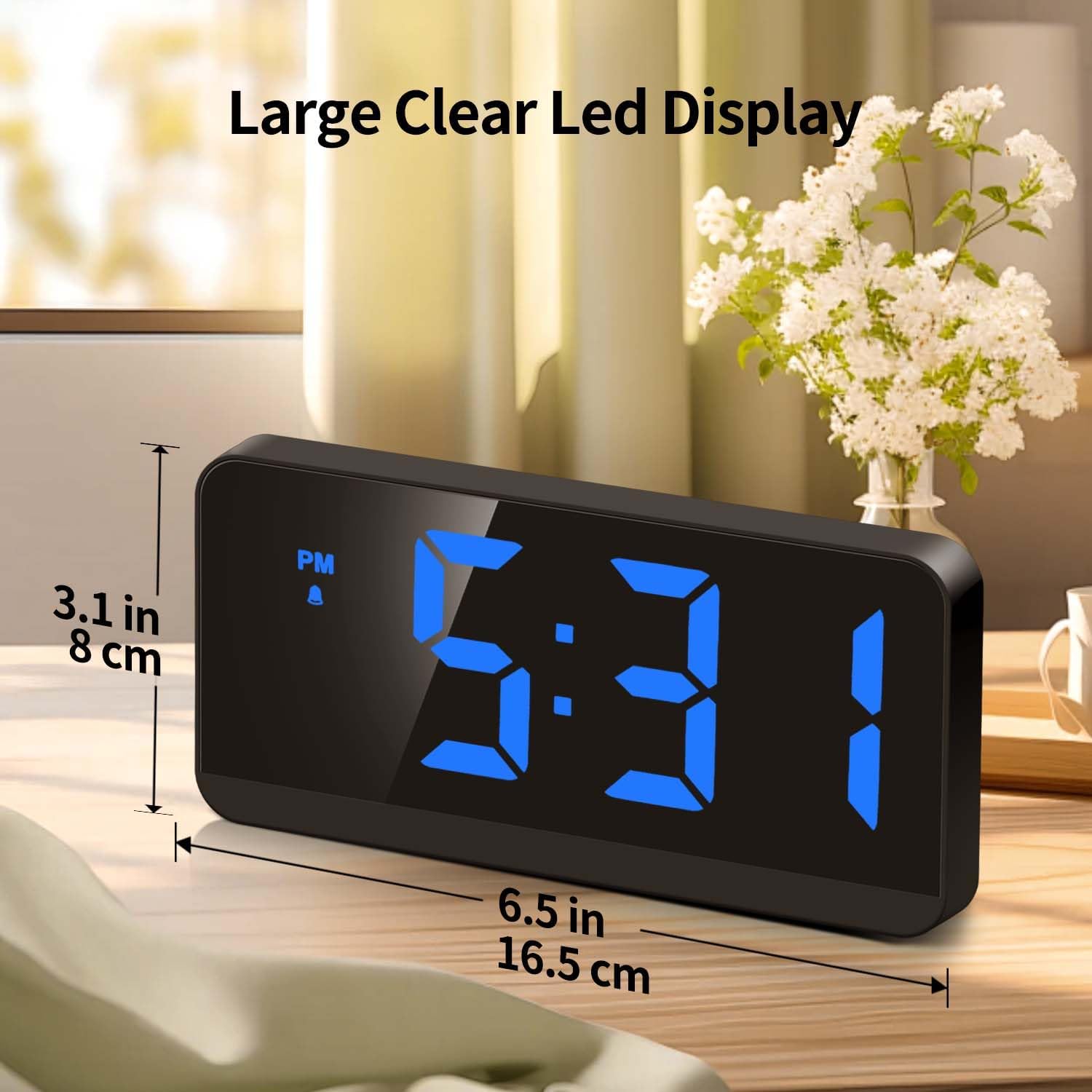 4 modos con gran pantalla LED clara: estos despertadores para dormitorios tienen 4 modos: modo de reloj de 12/24 horas, modo de fecha, modo de temperatura °C/℉ y modo de alarma con repetición. El tamaño del reloj digital para dormitorio es de 3.1 x 6.5 pulgadas. Este pequeño reloj despertador para mesita de noche es un lindo reloj despertador portátil y regulable.