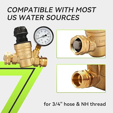 PROTEGE TU RV: Regula la presión del agua que entra en tu caravana, protege la caravana/remolque de la alta presión del agua, asegura un flujo de agua constante. El medidor muestra hasta 160 PSI, el ajuste de fábrica es de aproximadamente 45 PSI.